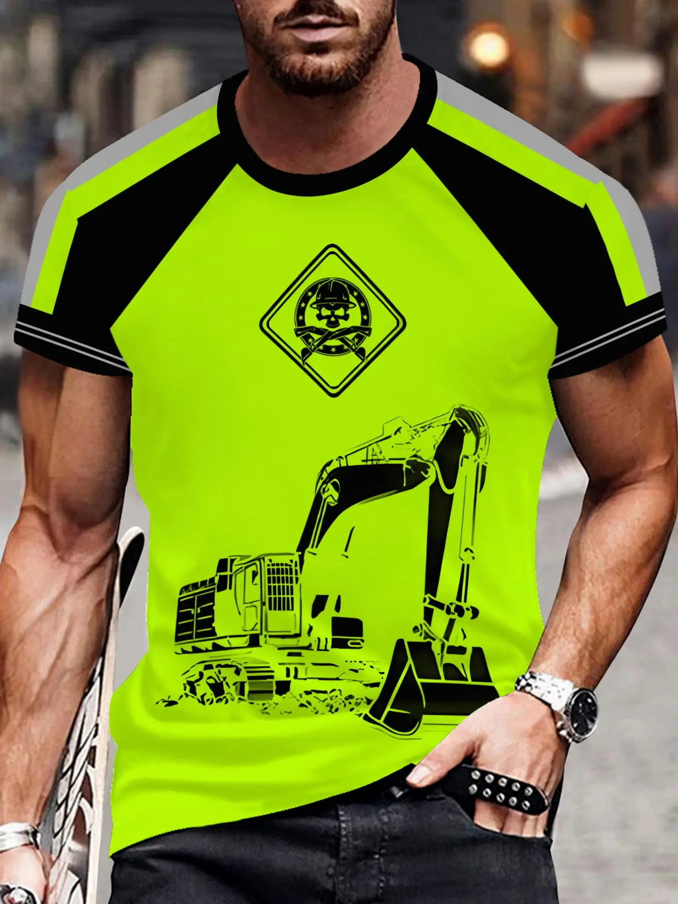 5. Men's Fluorescent Skull T-Shirt, Construction Worker Style, Half Sleeve, Loose-Fit, Casual Fashion, Long Clothing