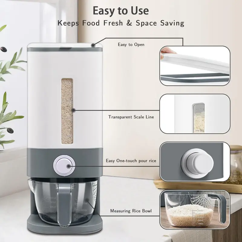 [Rice Dispenser Keep Fresh]As a general rule, regardless of the variety of uncooked rice, way to avoid spoilage or infestation and extend shelf life is to keep it in storage containers in a cool, dark, dry place.Rice Container help store your rice clean and dry to stave off damaged or .A good rice container replaces bag storage,so there is no mess in the kitchen;just scoop your rice out of the container and put it in a pan until it’s ready to serve