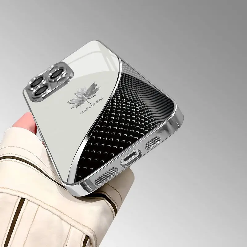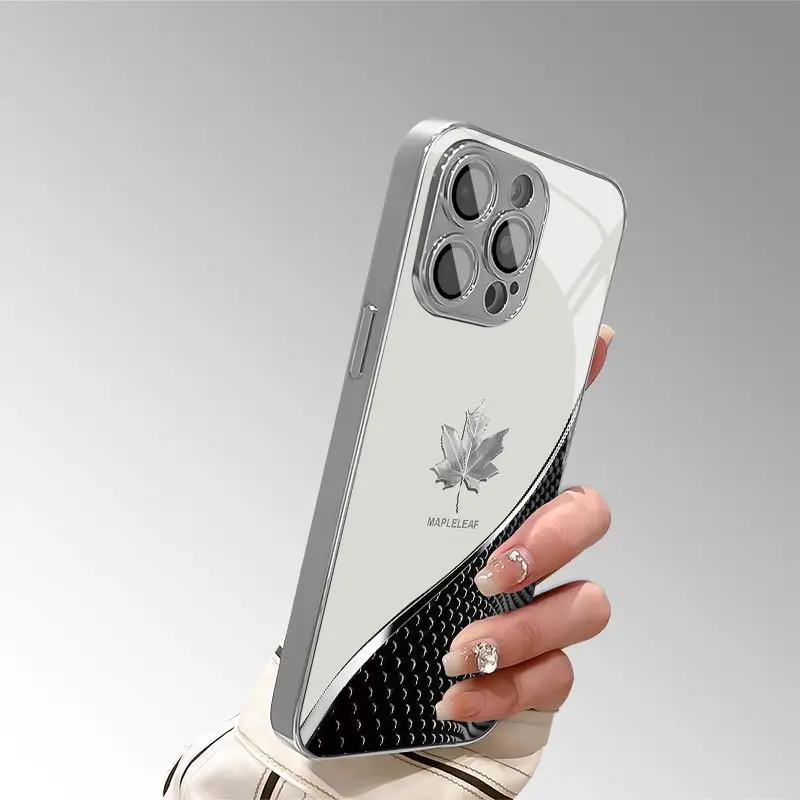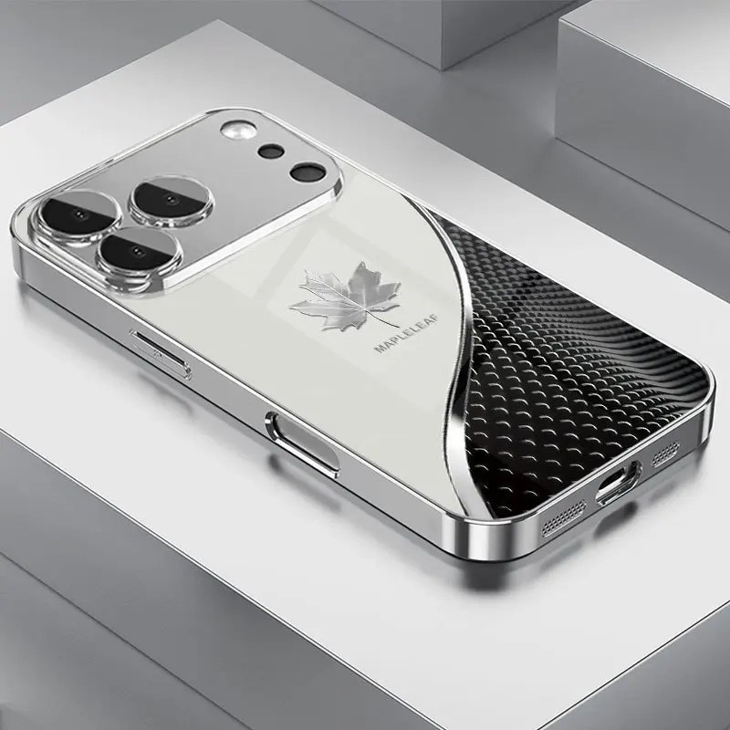 Tech-inspired curved silver maple leaf pattern electroplated high-definition glass phone case for iPhone 17 16 15 14 13 12 11 pro max, stylish protective case, luxurious glass case, suitable as a gift for friends and couples
