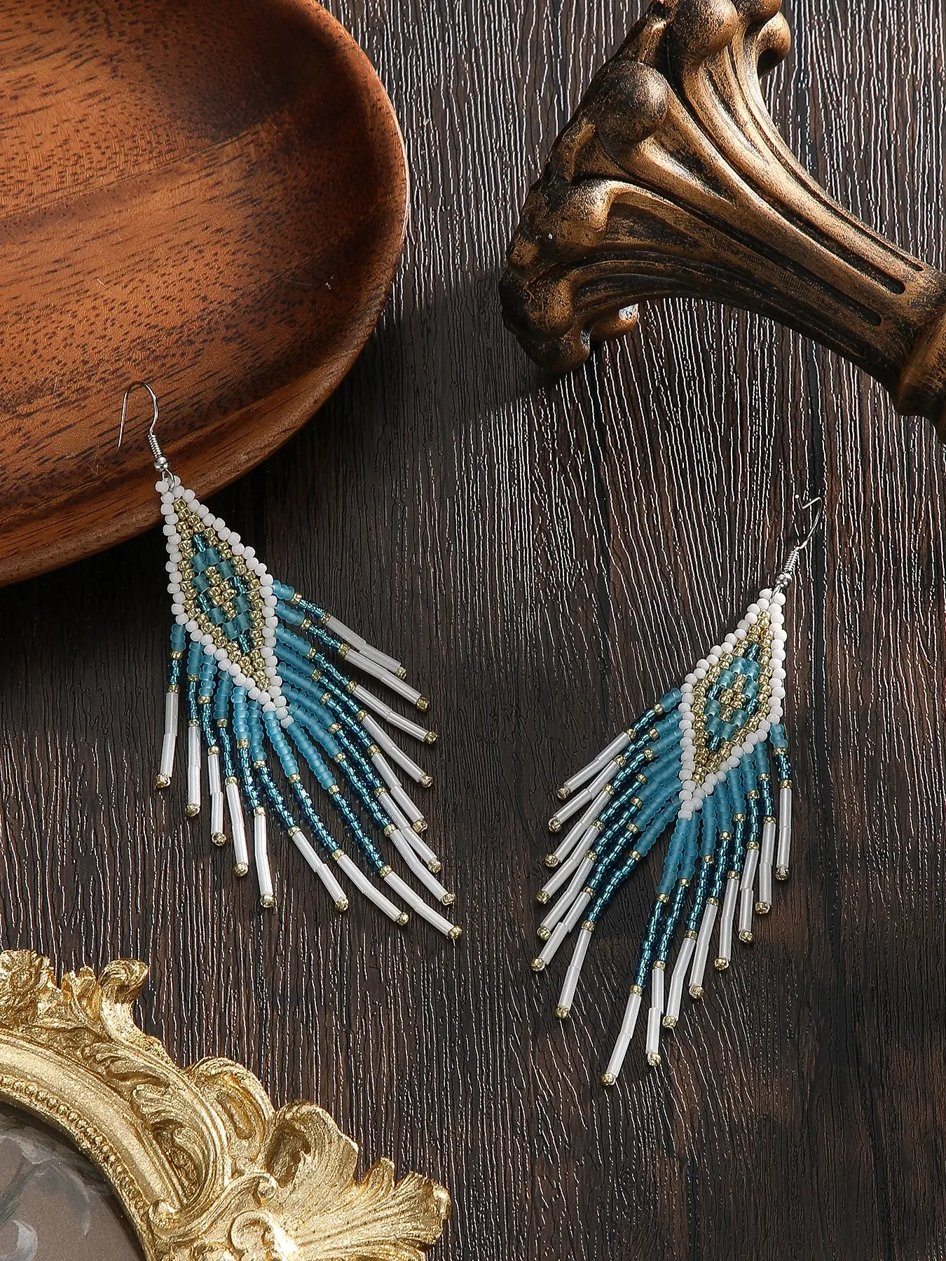 Bohemian Handmade Tassel Earrings, Women's Fashion Jewelry, Blue Geometric Pattern, Daily Wear, Holiday Gift Choice