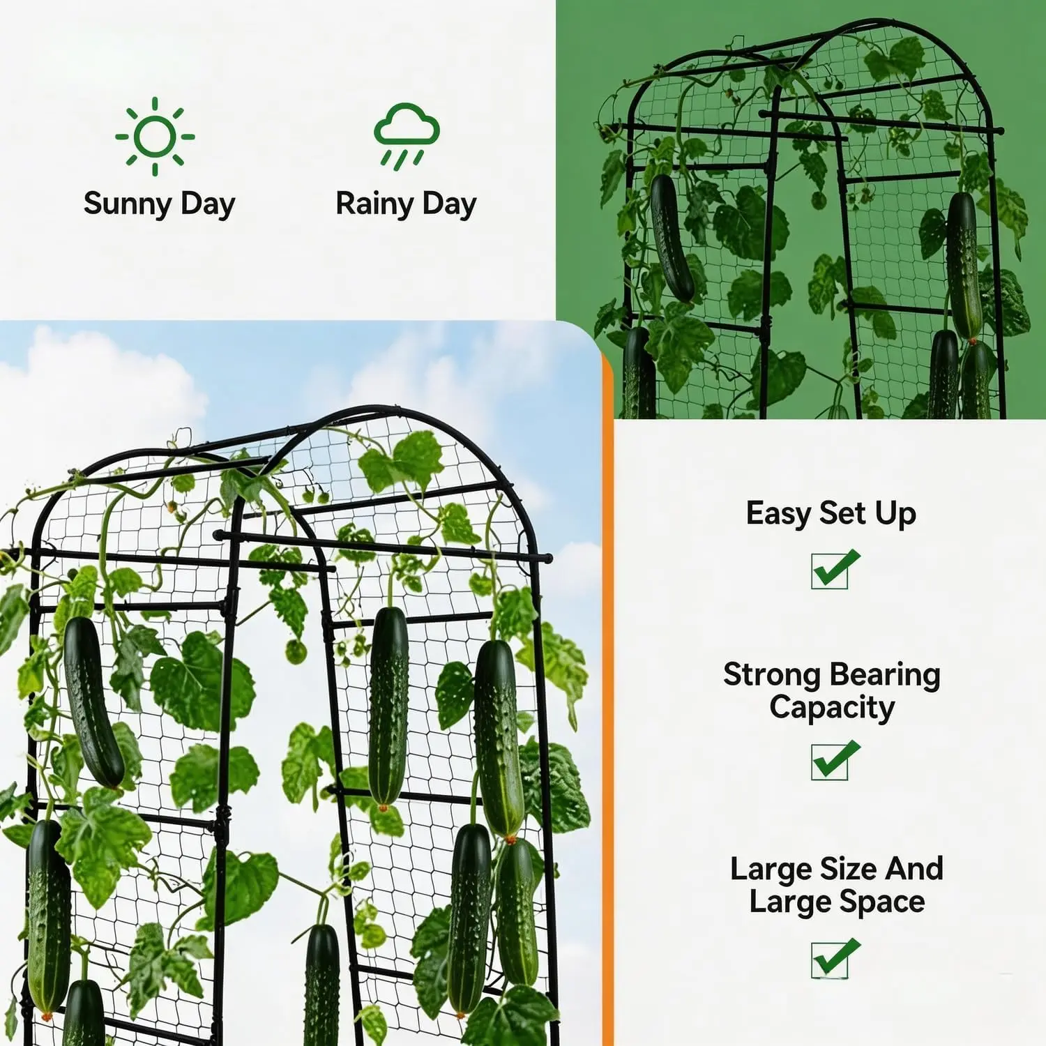 ·【Sturdy, Weather-Resistant Frame】Made from green metal pipes with a protective, rust-resistant coating and strong plastic connectors, this trellis is built to stand strong through wind, rain, and full-season outdoor use.