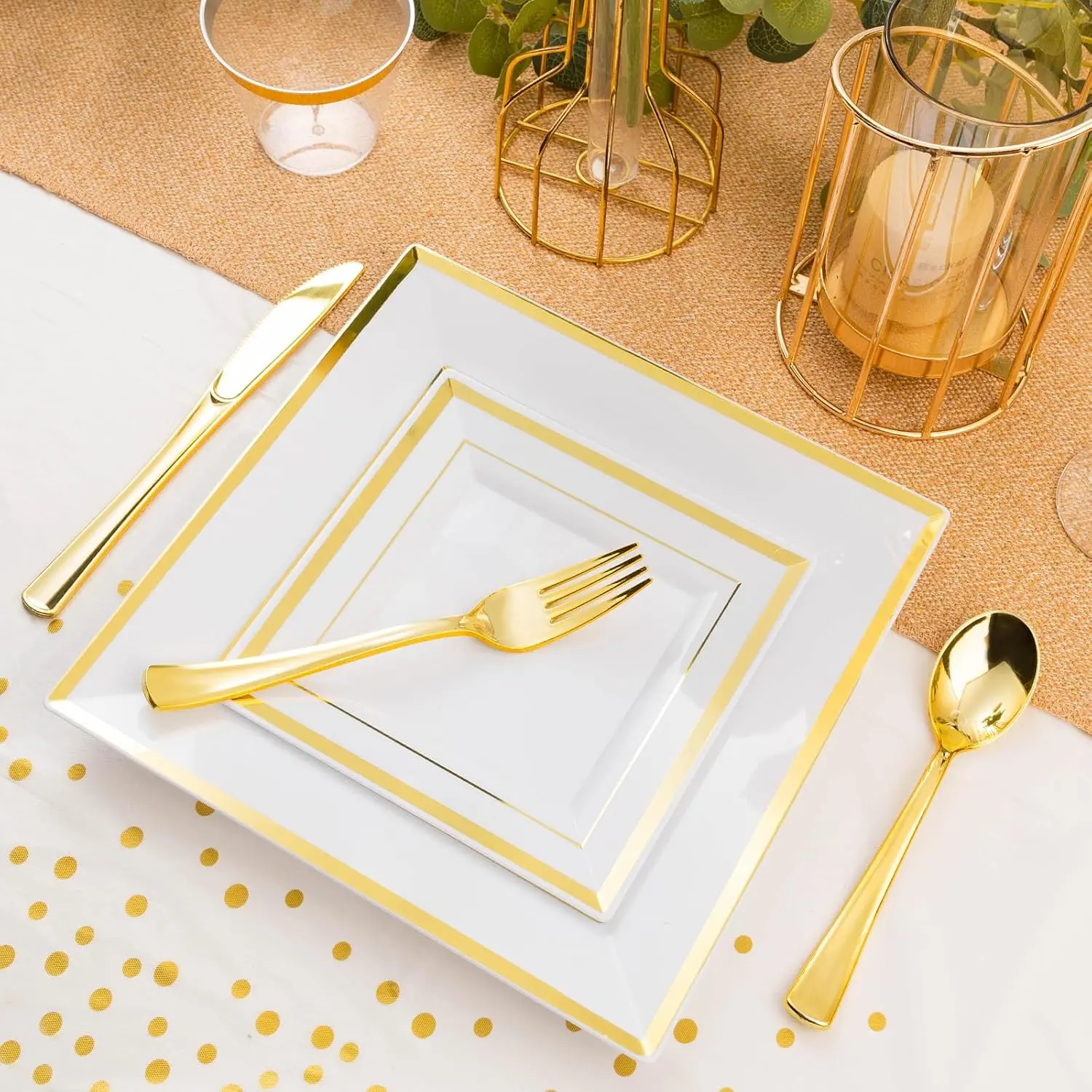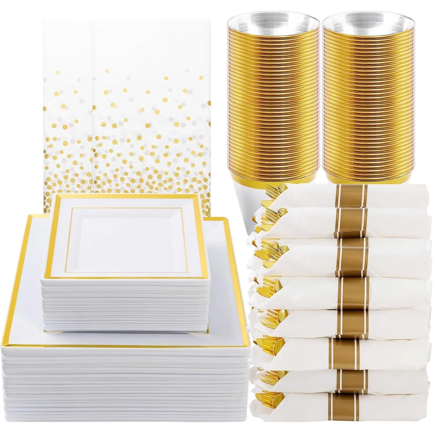 Goodluck 352 Pieces Gold Dinnerware Set for 50 Guests, Thanksgiving Square Plastic Plates with Gold Trim, Include: 100 Plastic Plates, 50 Rolled Napkins, 50 Cups, 50 Cutlery Set and 2 Tablecloth