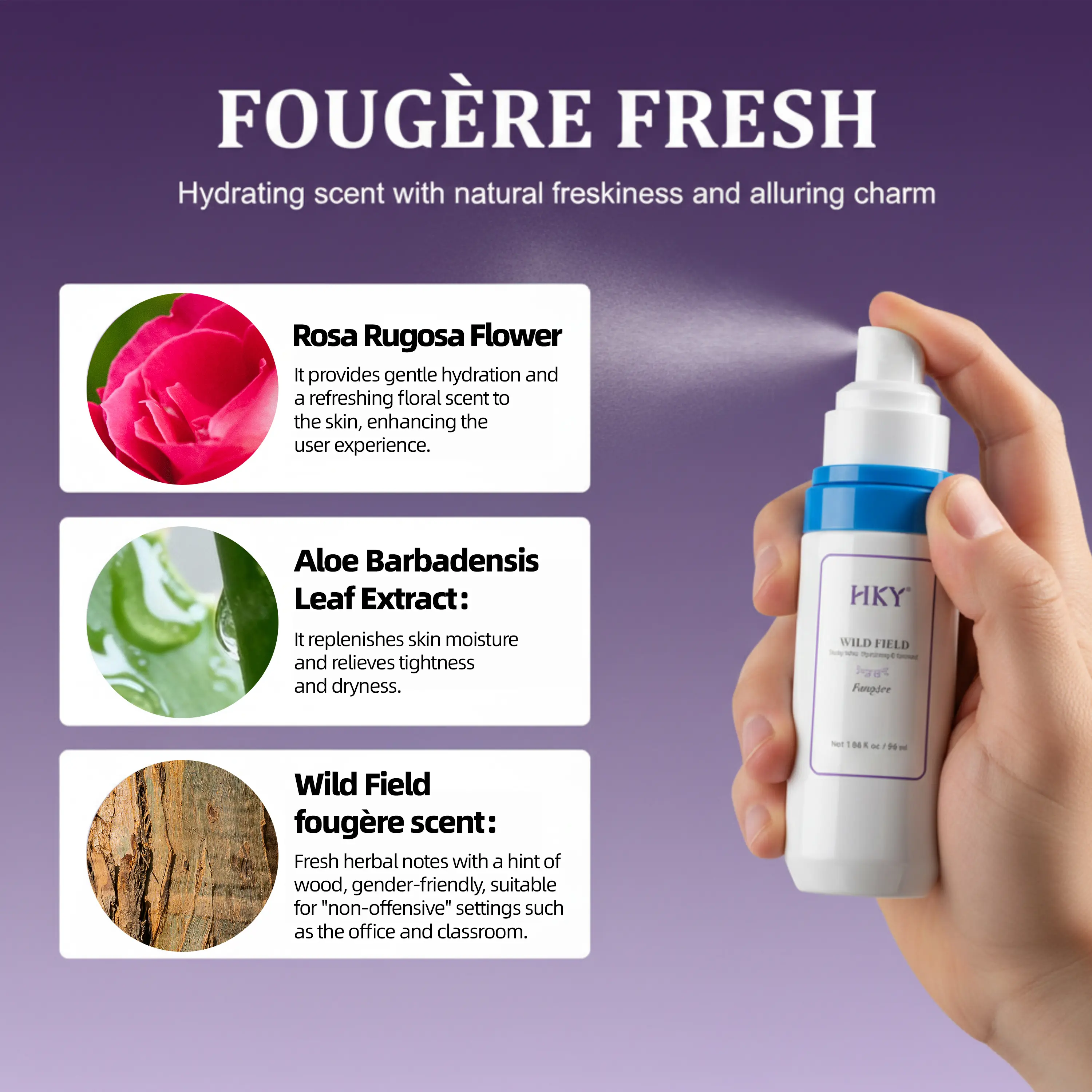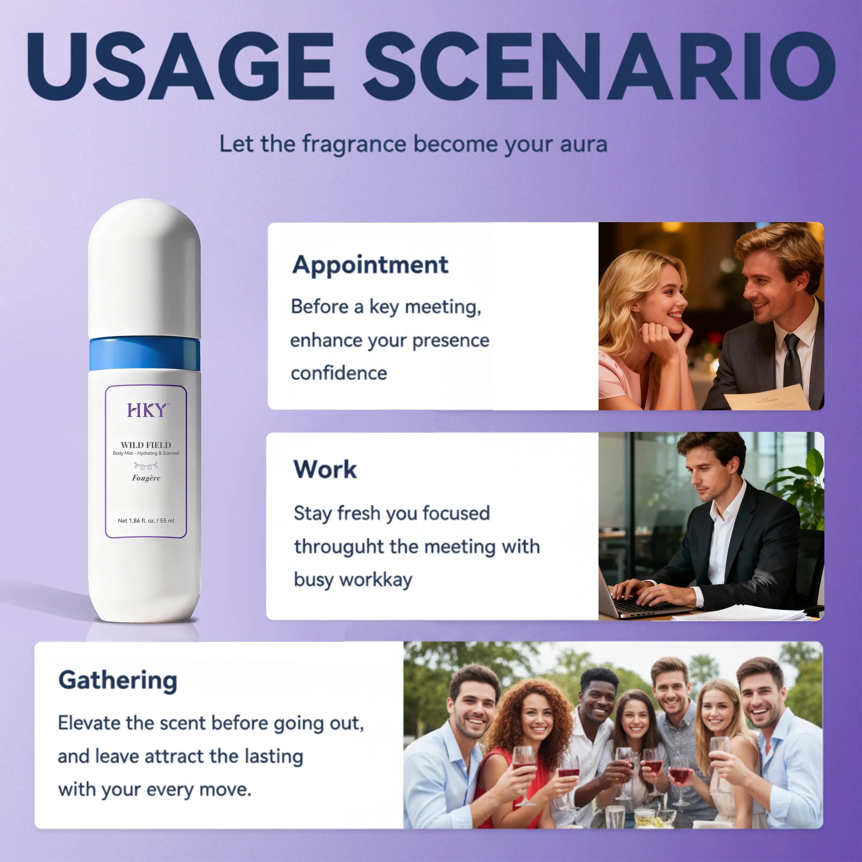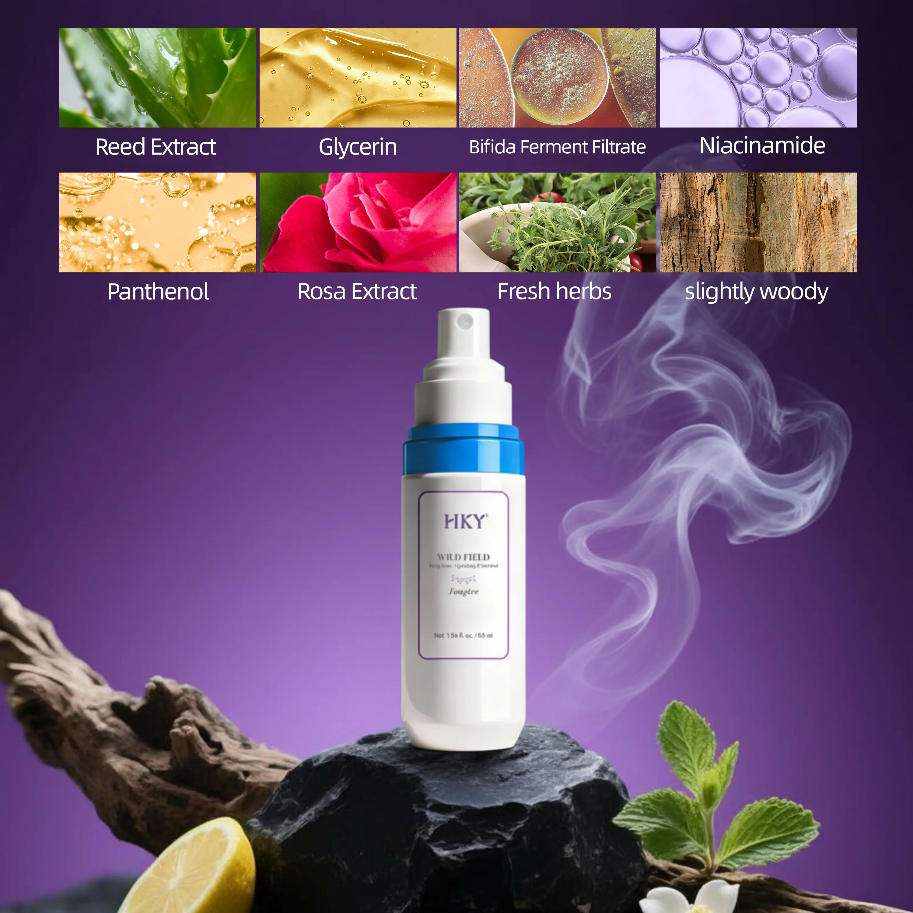 Escaping to nature with every spritz. Top Notes: Fresh Morning Dew, Green Leaf. Heart Notes: Wild Rose, Lavender. Base Notes: Sandalwood, Warm Amber. Unisex and refreshing, evoking the freedom of an open field.