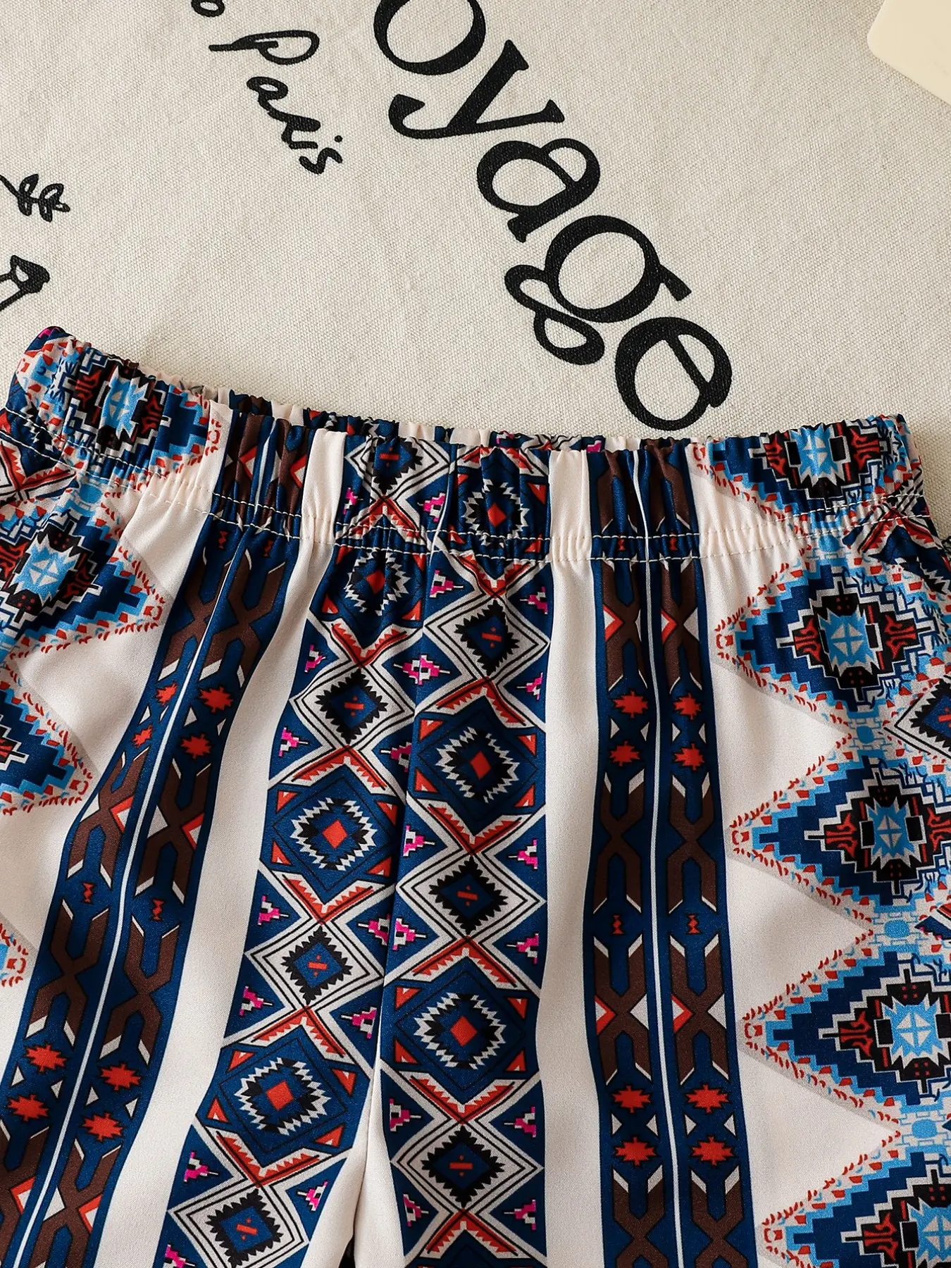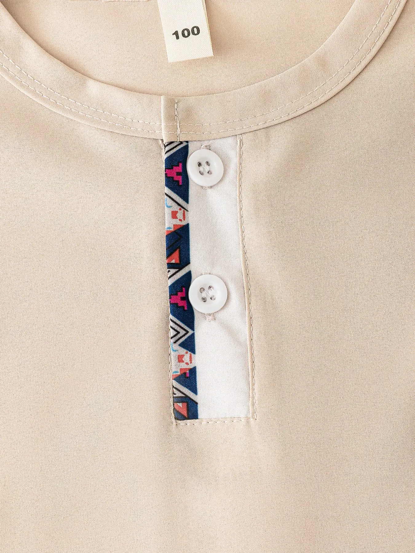 Boys' Summer Classic Fashion Set, Button Half-Open Crew Neck Short Sleeve Top & Geometric Pattern Shorts, Breathable 2-Piece