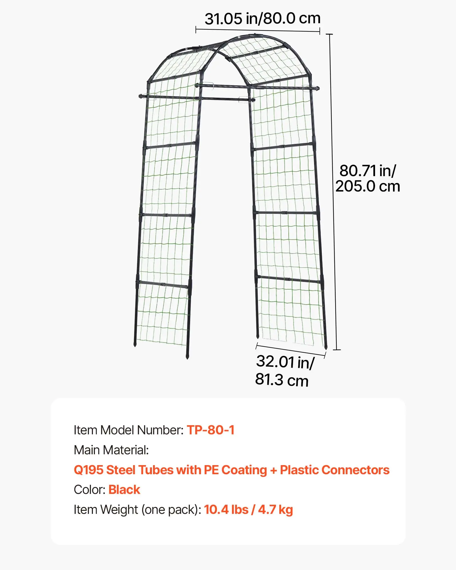 Product Specifications: This large arch-shaped climbing plants trellis measures 32.01 x 31.50 x 80.71 in / 813 x 800 x 2050 mm. The base width can be adjusted to meet different usage needs