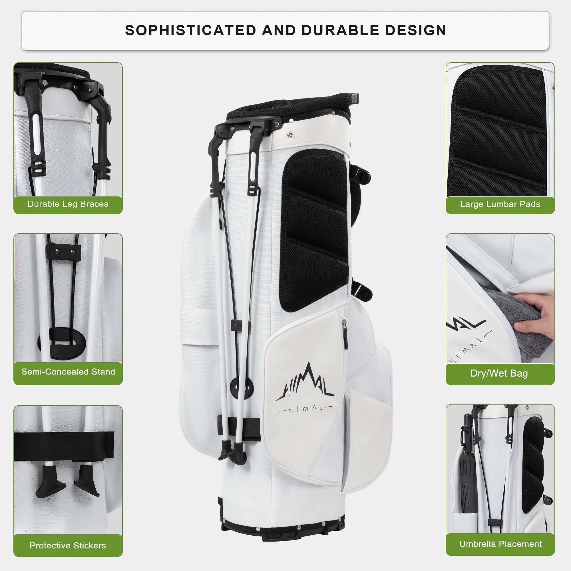 【STABLE & ELEGANT】Designed with a modern folding base and semi-concealed iron tube stand eunsures this golf stand bags durability and premium look