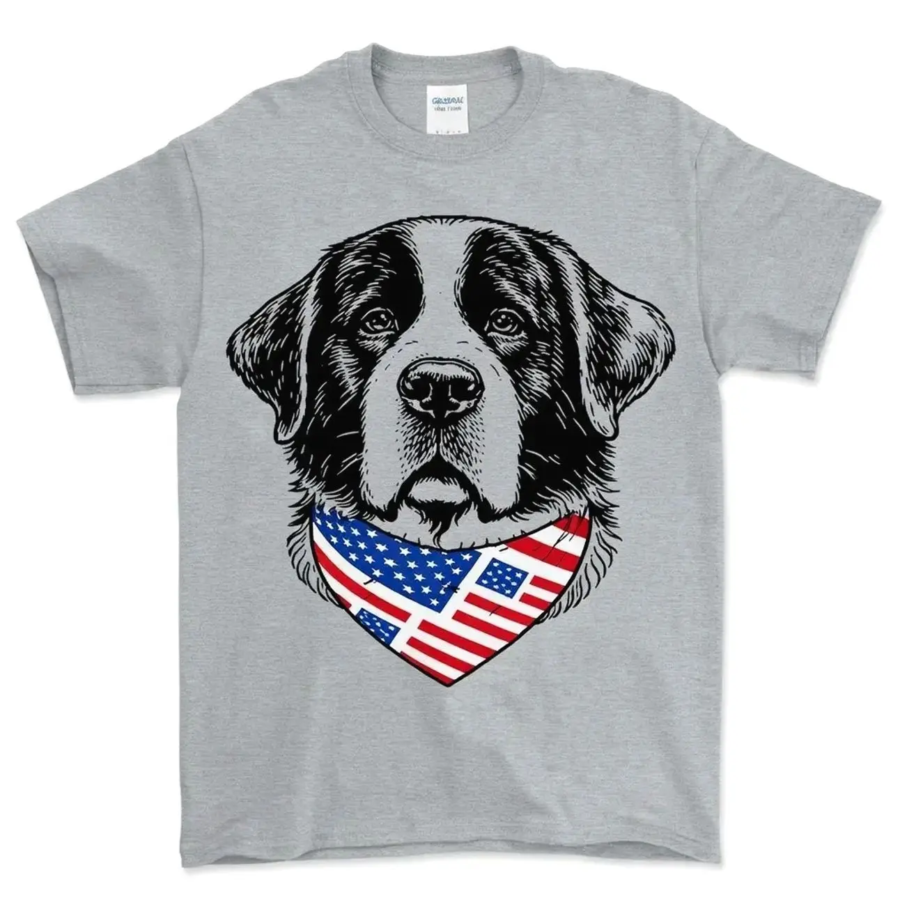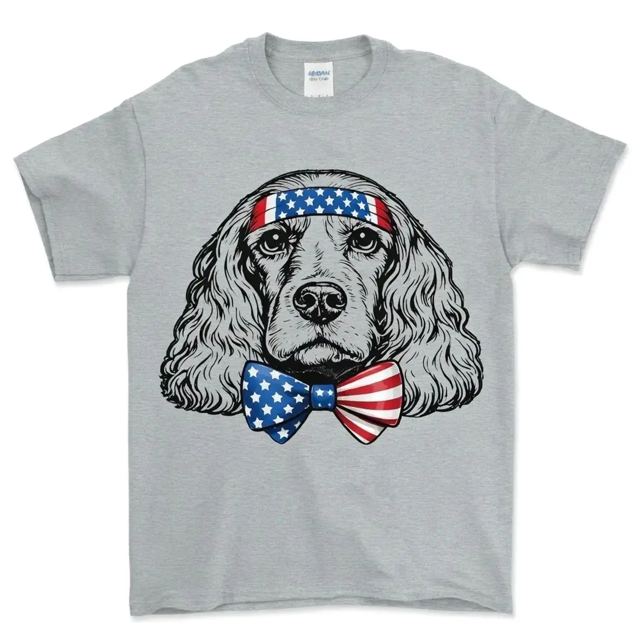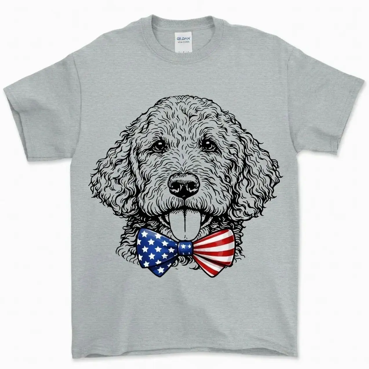 Puppy Love Dog T- Shirt showcasing 50 dog breeds in 4th of July Graphic, Sport Grey, Cute Puppy Independence Day Shirt for Dog Lovers, printed on a cozy Gildan unisex T Shirt for pet lovers