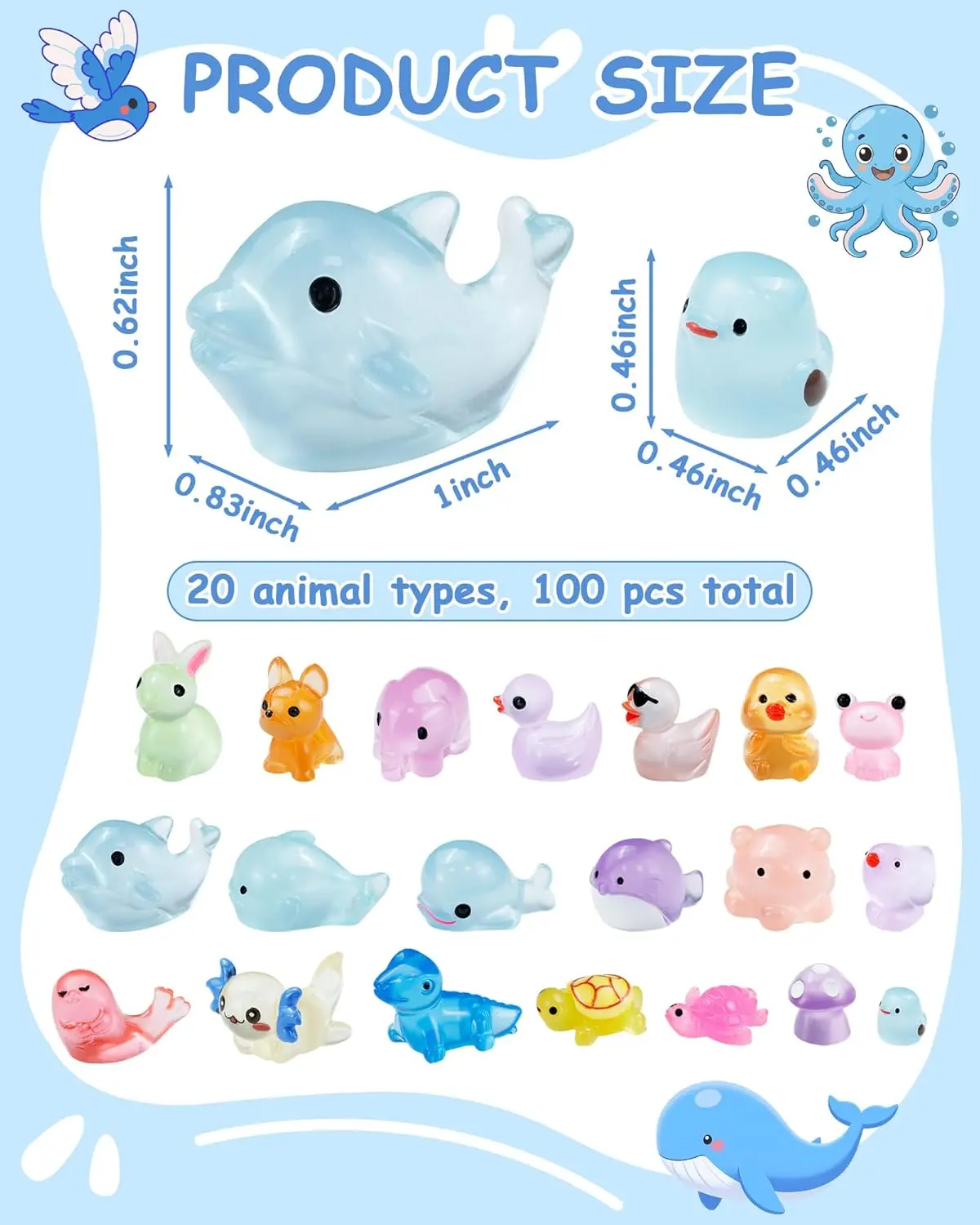 ·Massive 100 Pcs Resin Animals Bulk Set with 20 Styles: This complete glow in the dark animals collection includes 100 pieces of miniature resin animals featuring 20 different animal types. Discover tiny ducks, owls, frogs, dinosaurs, turtles and other luminous creatures - perfect for resin animals variety pack enthusiasts and mini animal collectors.