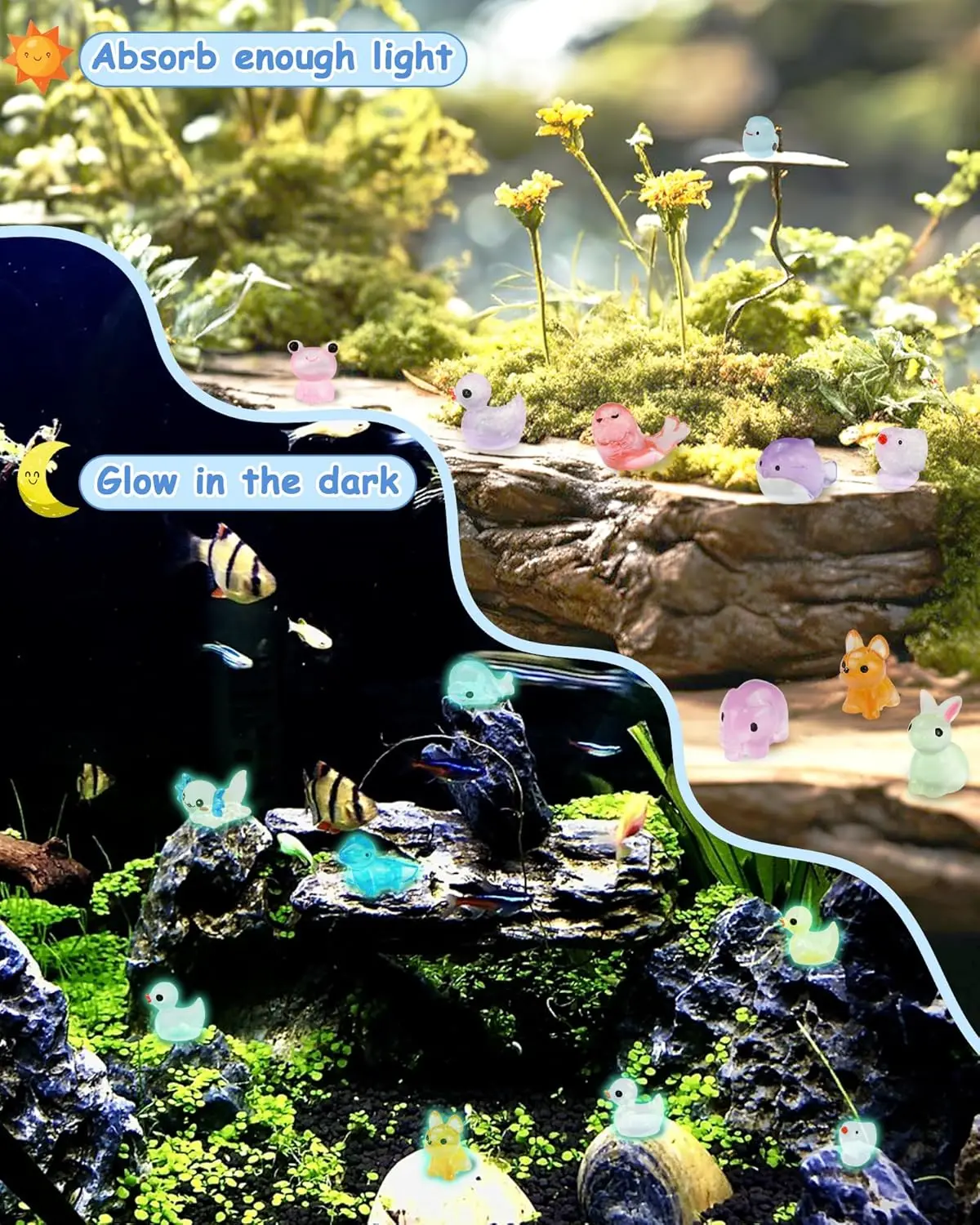 ·Super Bright Glow in The Dark Effect & Safe Material: Each mini glow in the dark animal absorbs light quickly and emits a vibrant glow for hours. These non-toxic resin mini figures are waterproof, fade-resistant, and suitable for both indoor and outdoor use in fairy gardens, aquarium landscapes, and home decor projects.