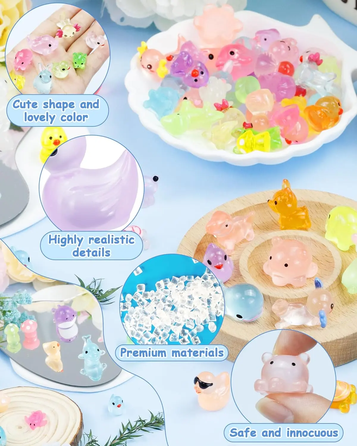 ·Premium Resin Mini Figures Collection with Multi-Use Value: This small resin animals set includes durable resin mini animals that maintain their vivid colors and glow effect over time. Use them as cake toppers, office desk decor, book nook accessories, plant pot decorations, DIY resin projects, artistic creations, or photography props - endless possibilities for creative applications.