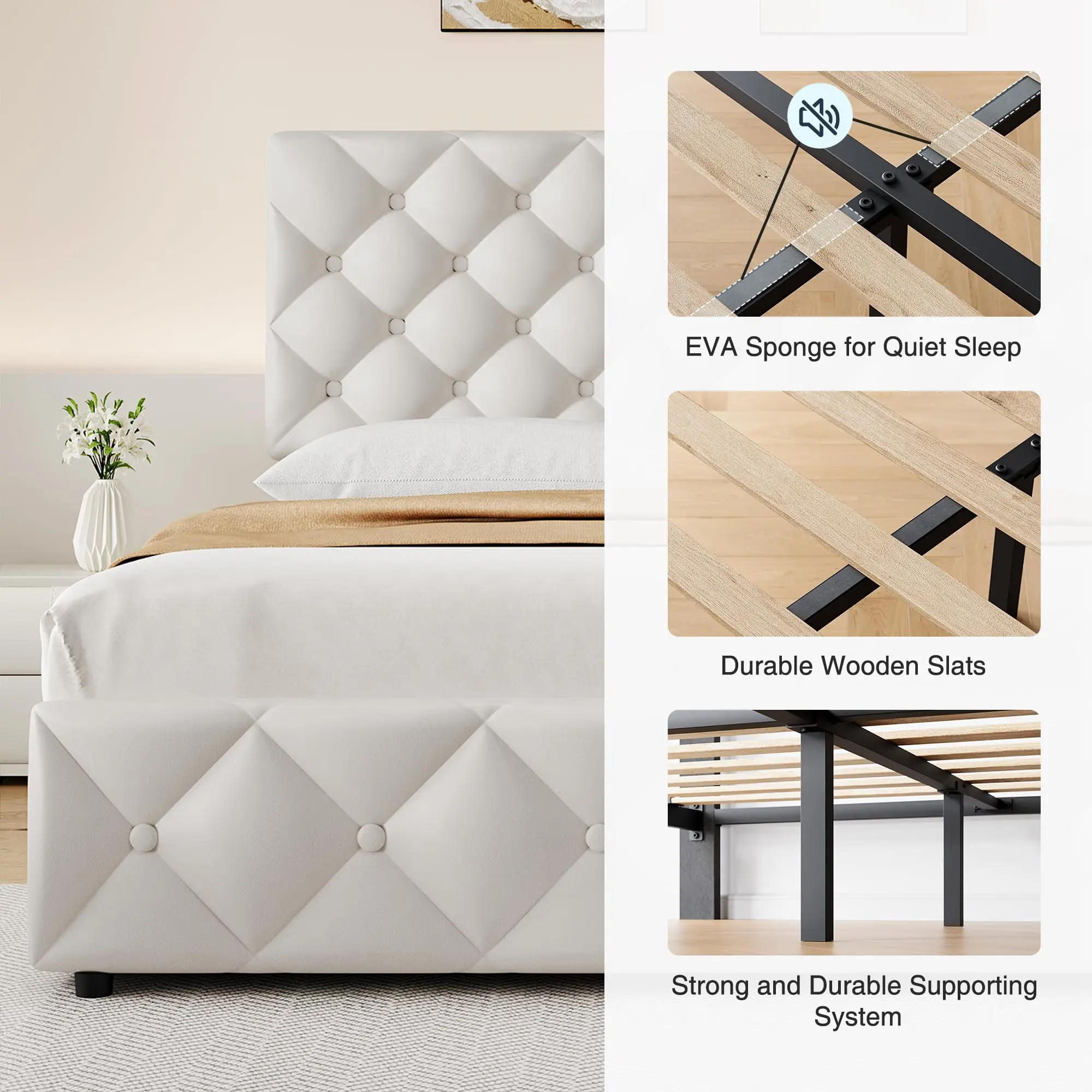 · 【Freely Adjustable Headboard】This thoughtfully designed bed features an adjustable headboard (42.9"-45.7" height) compatible with 6-12" mattresses, offering personalized support. The diamond-stitched linen upholstery with high-density foam padding delivers both luxurious comfort and ergonomic lumbar support, while the sturdy footboard ensures your mattress stays securely in place. Perfect for those seeking tailored comfort and refined style in their sleep sanctuary.