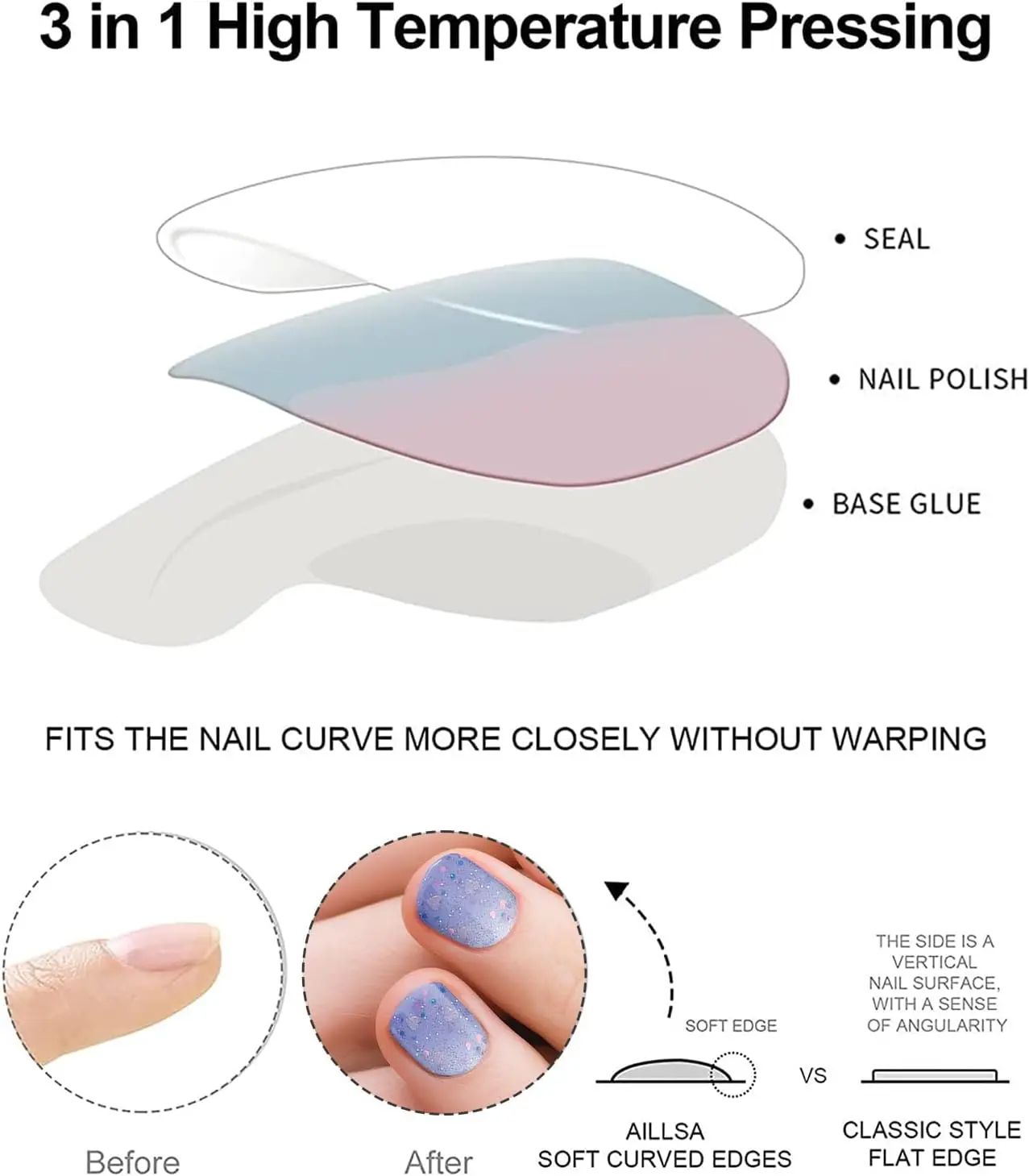 ·Real Gel Nail Polish Strips: Our semi cured gel nails are made of real liquid polymer gel, pre-cured 60% to maintain softness and elasticity. Upgrade the edge of the nail paste with the nail, good adhesion, not easy to fall off