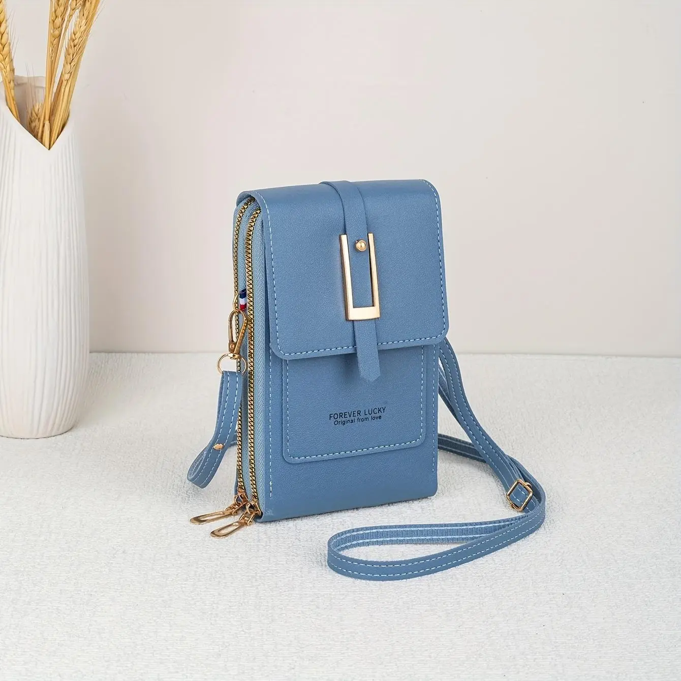 This crossbody bag features an adjustable strap for customizable wear. The bag features a slanted design for a modern aesthetic. Suitable for use as a phone bag, key bag, or coin purse.
