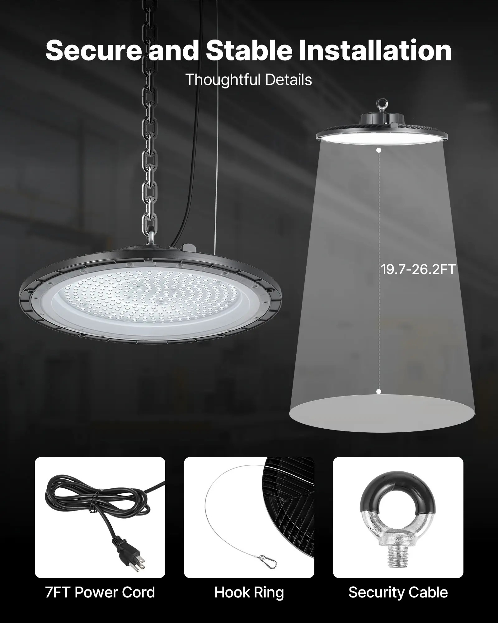 Energy-Efficient Performance: Equipped with 150W high-efficiency LED, these UFO LED lights provide bright illumination while saving power, consuming less energy than traditional lights. The 5000K natural white light reduces eye strain for prolonged work