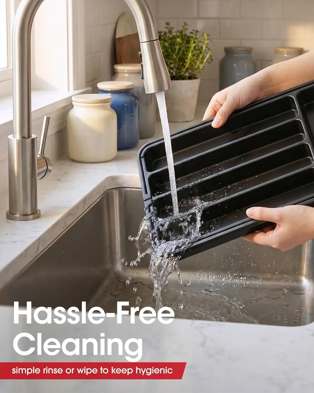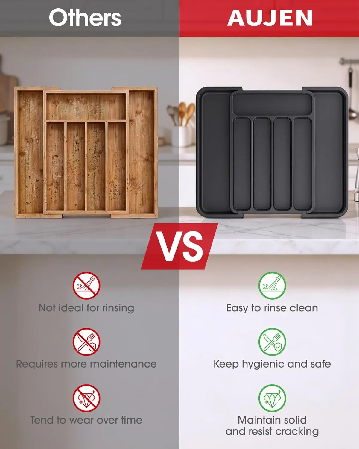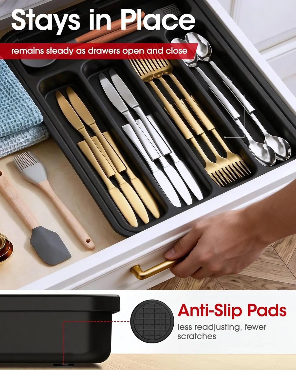 Anti-sliding pads on all four corners keep items securely in place. The buckle design allows smooth sliding and easy adjustment. Enjoy a seamlessly organized experience with AUJEN utensil holders. Prevent dividers from running off the rails for a hassle-free storage solution.