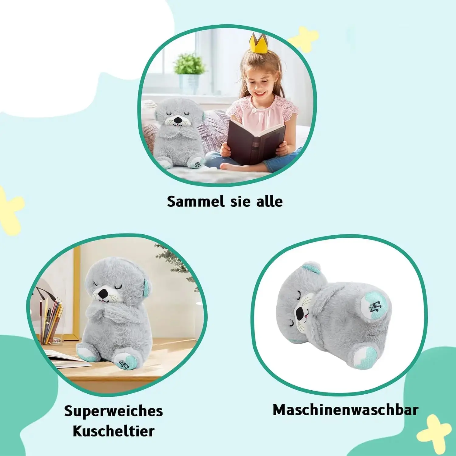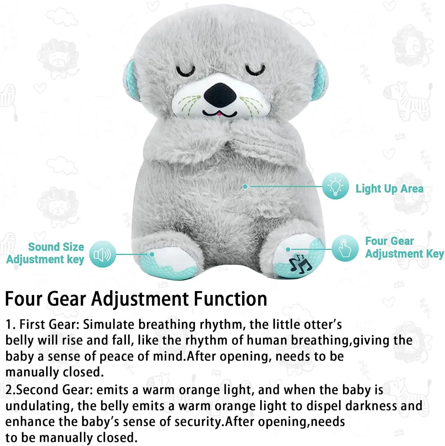 ·Four Gear Adjustment Function: First Gear: Simulate breathing stuffed animal, the anxiety breathing stuffed animal belly will rise and fall, like the change of human breathing, giving the baby a sense of peace of mind, needs to be manually closed.Second Gear: Emits a warm orange light, and when the baby is undulating, the belly emits a warm orange light to dispel darkness and enhance the baby's sense of security, needs to be manually closed.