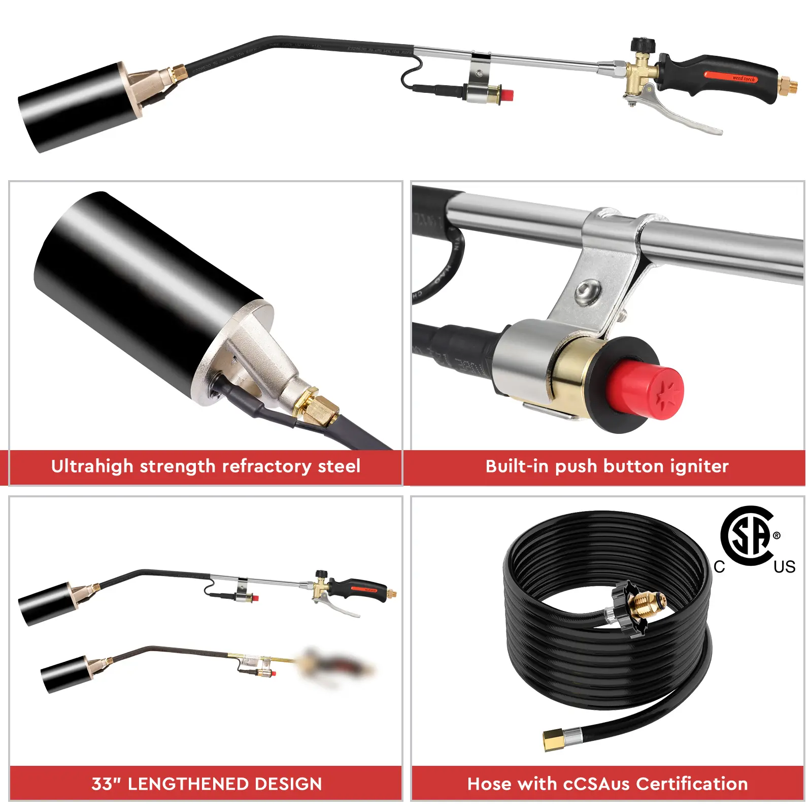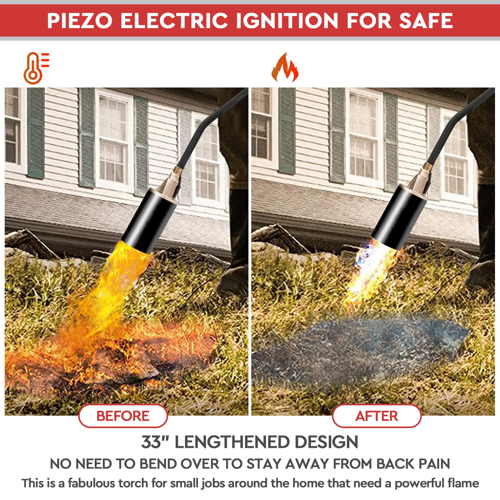 【Powerful & Efficient Performance】Designed for outdoor tasks, this propane weed torch features a 33" extended design for comfortable upright use. The large nozzle delivers a strong, steady flame to handle weeding and other tasks efficiently.