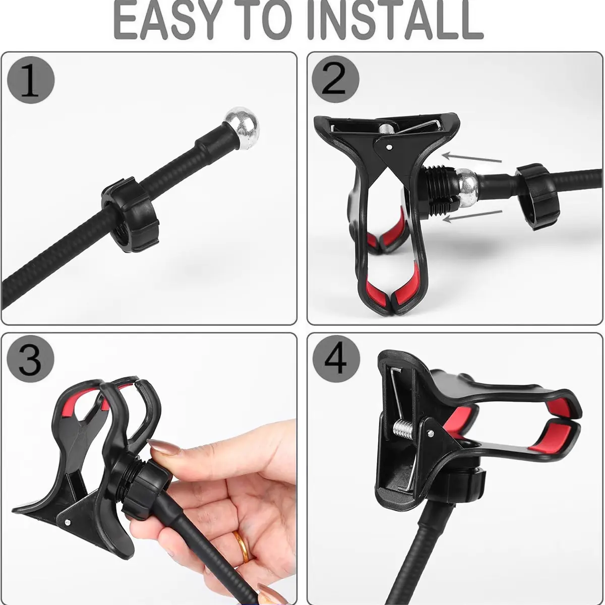 Universal Compatibility: This universal swivel phone stand is suitable for 4-7 inch mobile phones. It is applicable even when the phone case is thick. The phone holder is equipped with soft rubber pads for better anti-slip performance and stronger protection. Stable Swivel Arm: The total length of our phone stand is 27.5 inches (including the clip), made of more sturdy metal materials, with better stability and durability. It can remain stable even after connecting the phone and will not sag. It can also be flexibly bent in any direction to adapt to your line of sight. Note: The long arm is not a super flexible arm, but designed to enhance stability. Easy Installation: Our lazy phone stand is stable and quick to install. It comes with an adjustable base for the clip. The height ranges from 0 to 2 inches (5 centimeters). The phone holder can be firmly installed on the bed frame, bedside, headboard, bedside table, bathroom, desk, coffee table, and kitchen countertop, etc. The base of the stand adopts a non-slip silicone base design, which will not scratch the furniture surface. 360 Degree Angle Adjustment: The phone holder supports 360-degree rotation, allowing for quick adjustment to the desired viewing angle. It is convenient and flexible, without the need to bend the entire snake neck each time.