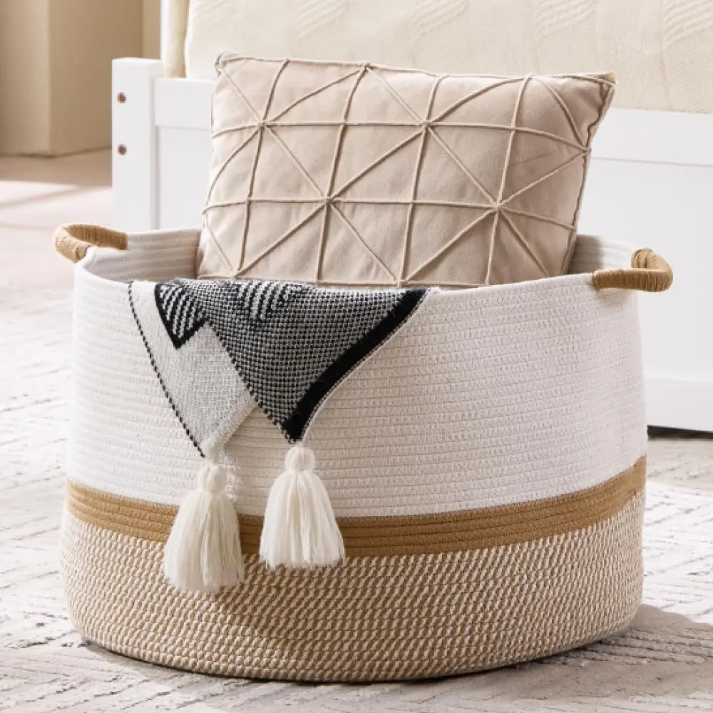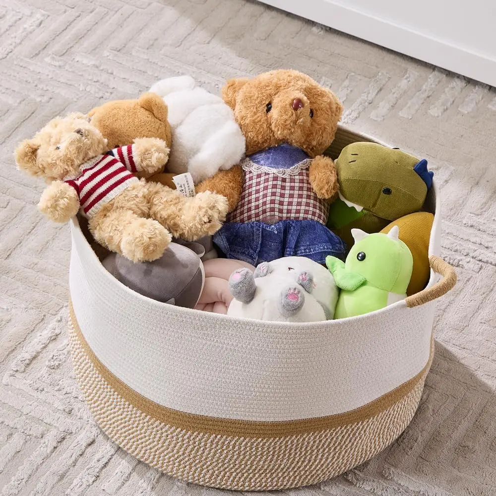 Woven cotton rope large storage basket, 20 in x 13 in, 85L, decorative nursery basket for room organization, suitable for pillows, blankets, and doll storage.
