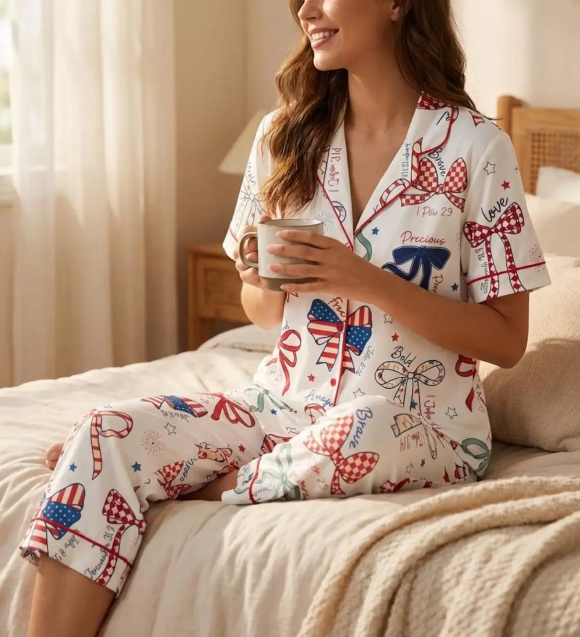 USA 250th Anniversary Patriotic Pajamas Satin Silk Set, 4th of July Pajamas Sets, USA Flag Coquette Bow Patriotic Premium Satin Pajamas, Gift For Her, Independence Day Fourth of July Pajama Set, Women Sleepwear