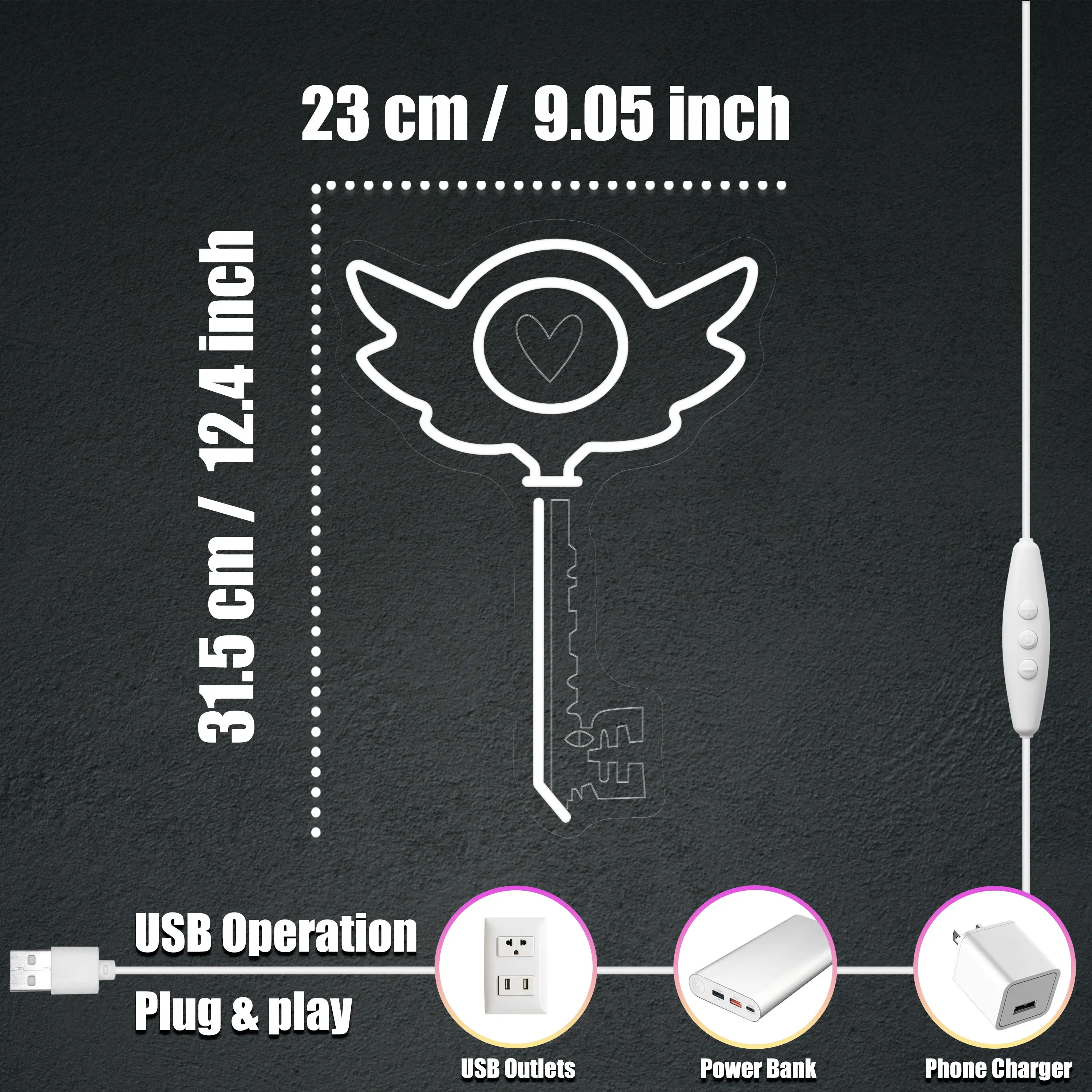 Gothic Heart Key Neon Sign, Angel Wing LED Light, Romantic Dark Aesthetic Room Decor, USB Powered Neon Lamp for Bedroom, Bar, Gamer Room Gift