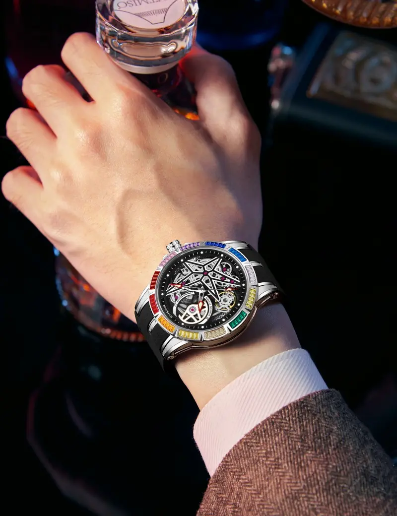 Elevate your style with this stunning skeleton automatic watch, featuring a bold star-shaped hollow dial and a sparkling crystal-encrusted bezel. The intricate mechanical movement is fully visible, showcasing detailed gears and ruby bearings for a luxurious, high-end look.