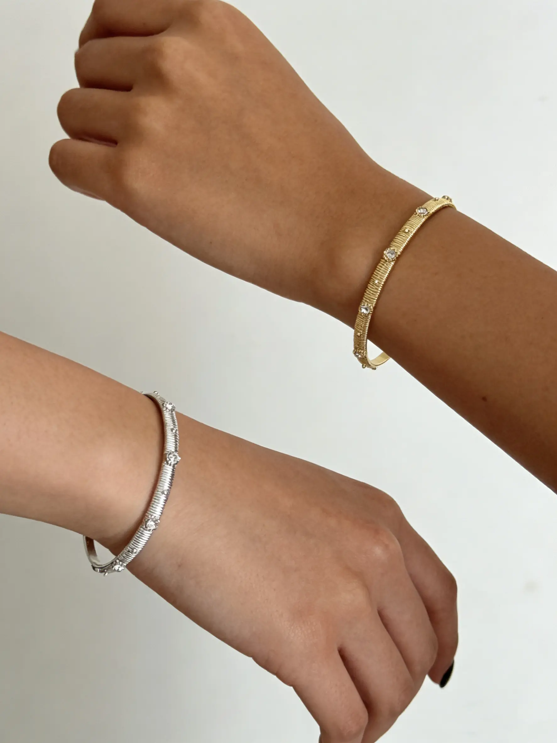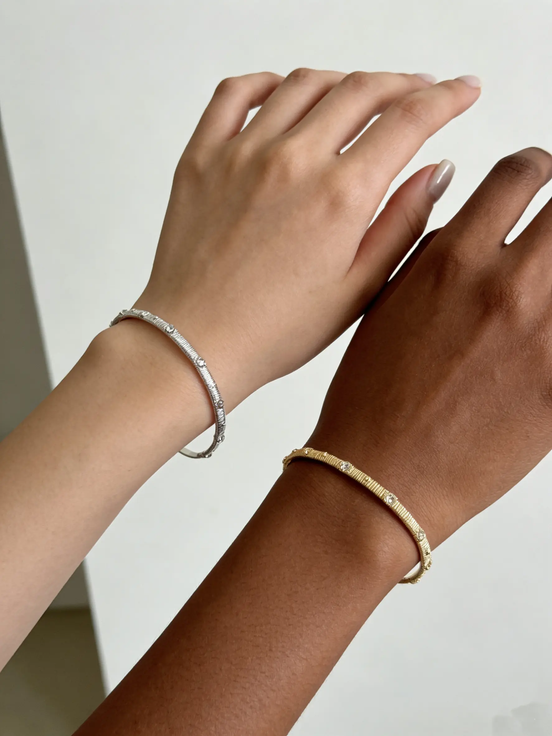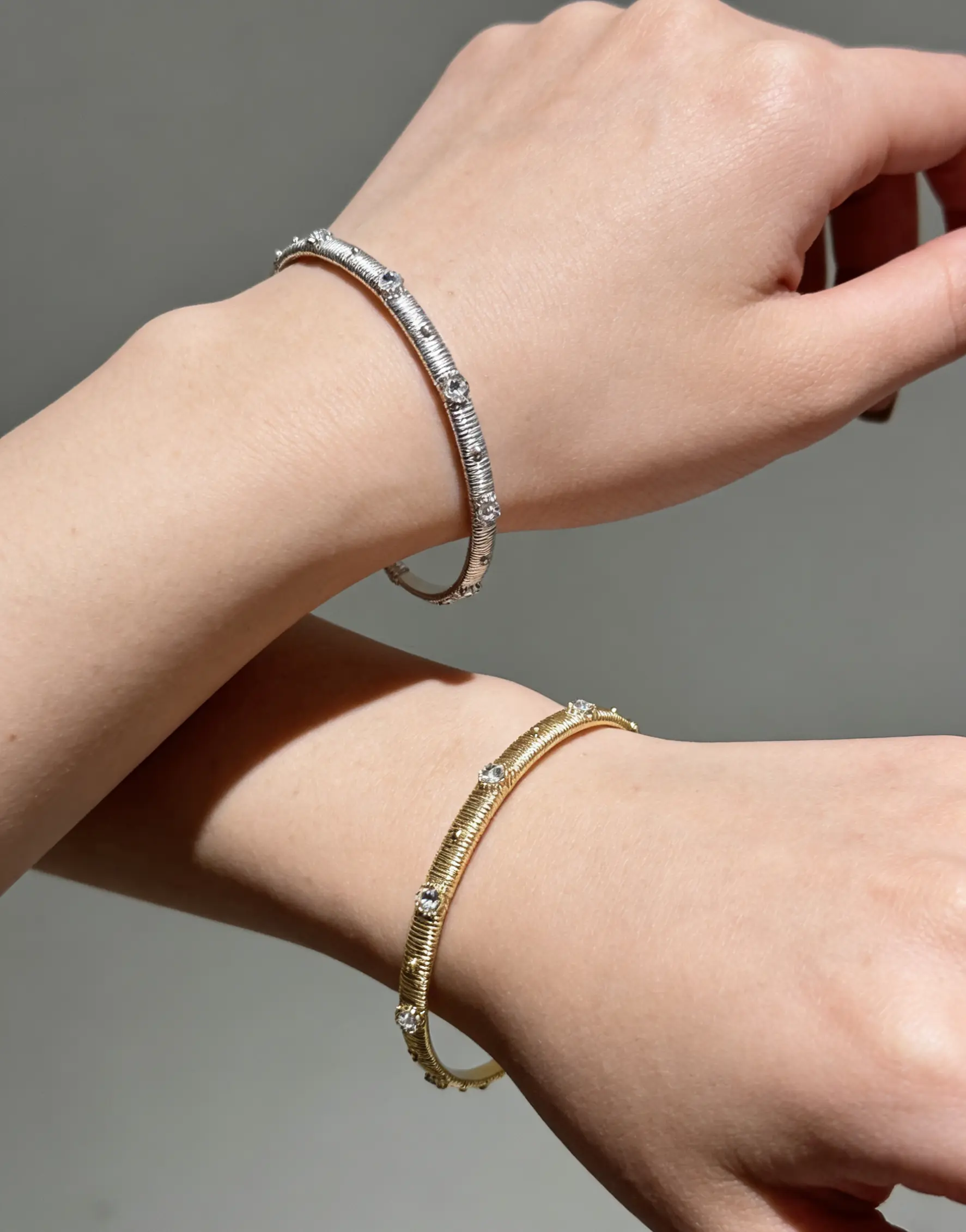 The bracelet’s defining feature is its intricate, hand-finished ribbed band, inspired by the timeless coiled jewelry of luxury heritage houses. Each ridge is precision-engineered to create a dynamic, multi-faceted surface that shimmers with subtle radiance, while hand-set, brilliant-cut cubic zirconia stones are artfully spaced along the band, adding bursts of dazzling sparkle that elevate the design from everyday to extraordinary. The stones are secured in delicate, raised settings that enhance their brilliance, ensuring they catch the light from every angle.
