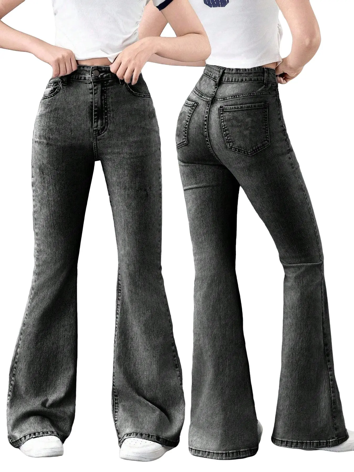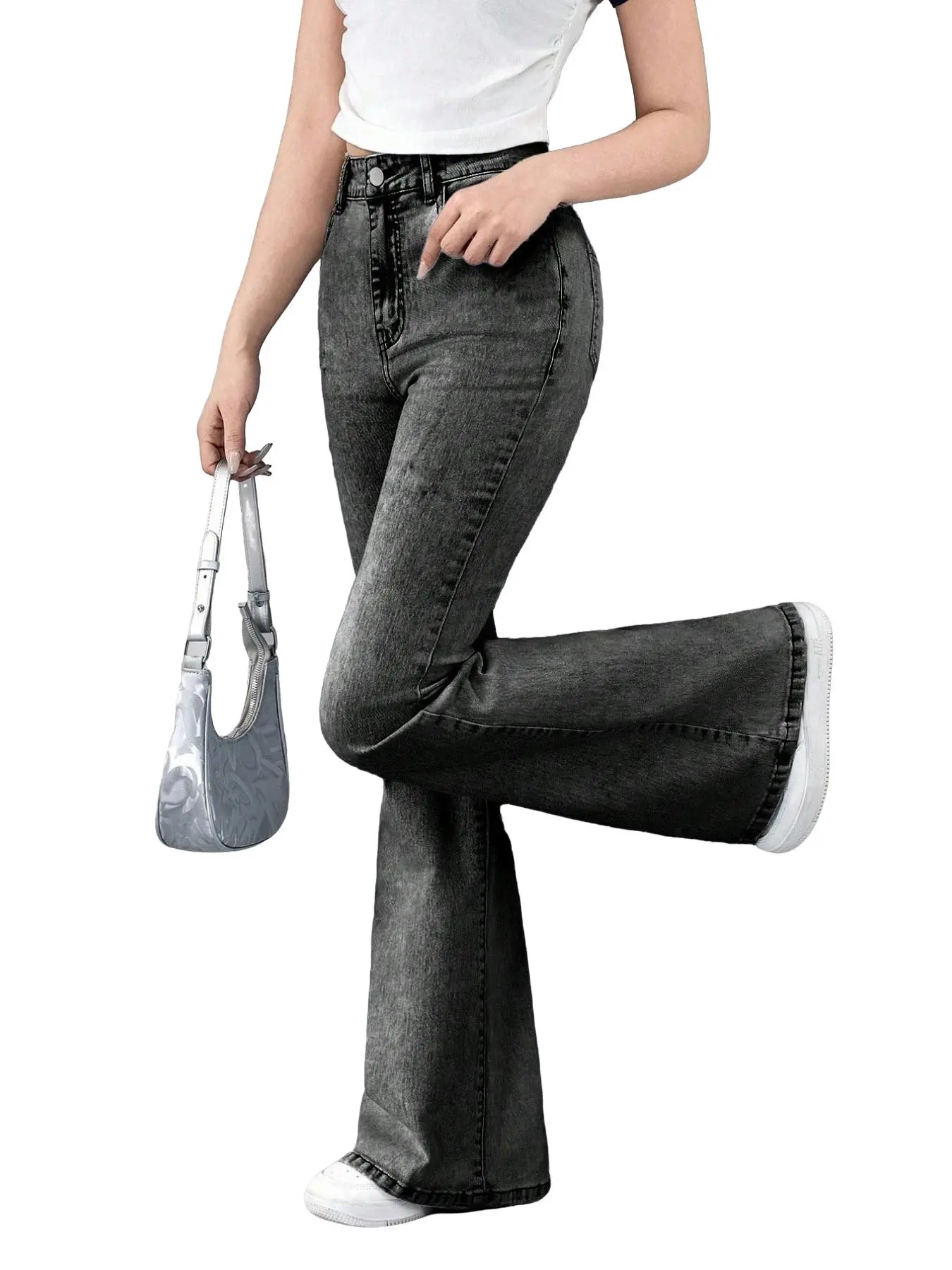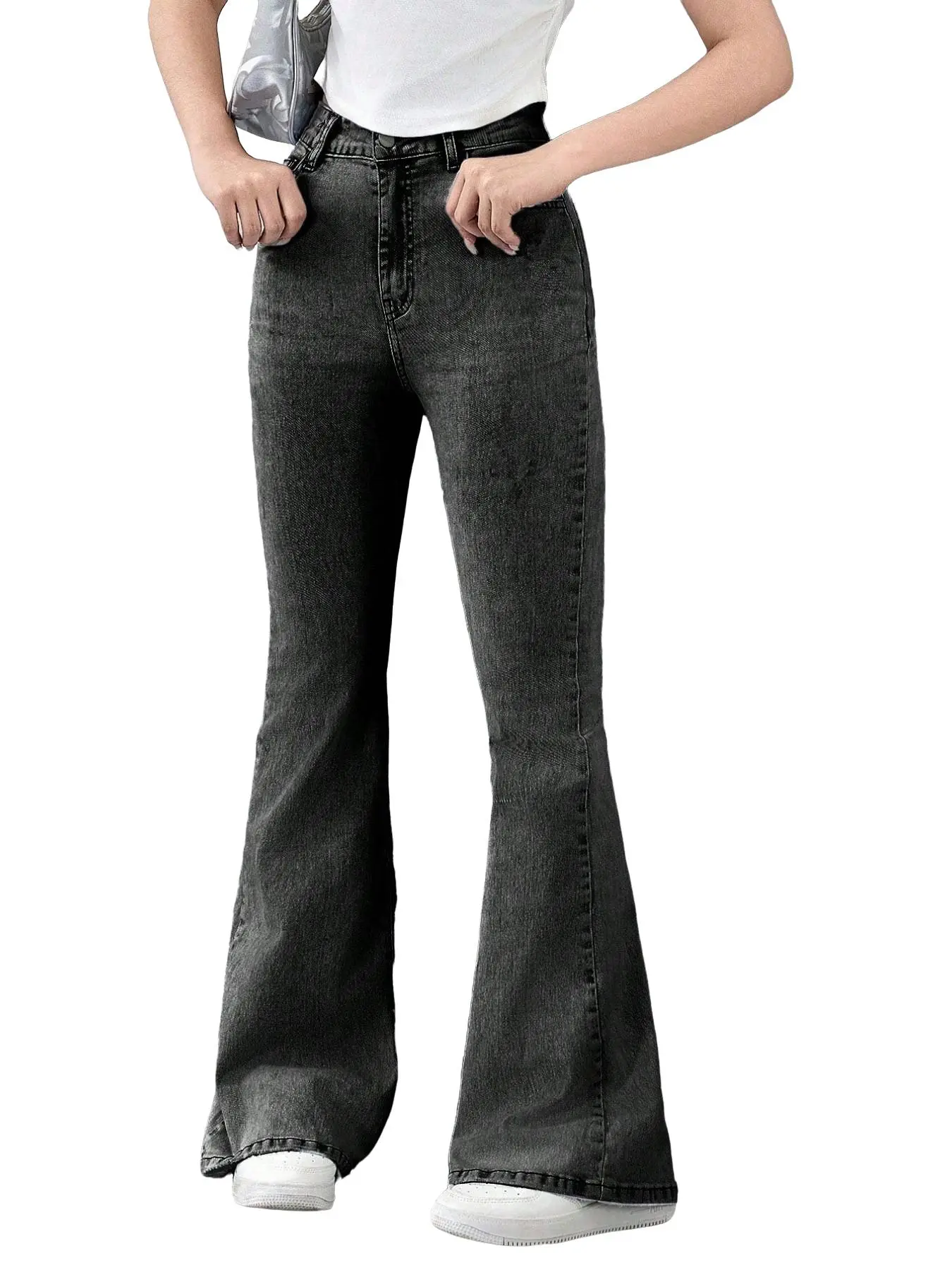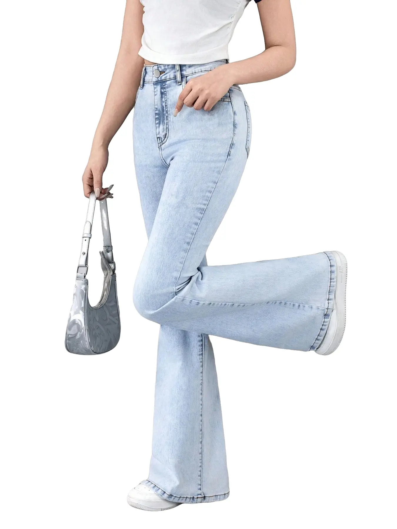 Girls' Fashionable Elastic Bell-Bottom Jeans, Comfortable Washed Solid Color Denim Jeans, Casual Spring Summer Versatile, Light Wash Jeans, Essential Jeans