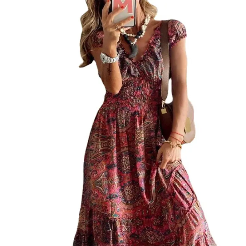 2022 New Model: Vintage-style long dress with a cinched waist and floral print, large hemline dress