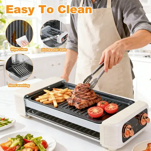 ·Smokeless & Easy to Clean: Smokeless heating design with non-stick coated griddle pan reduces oil splatter and smoke. Removable drip tray and accessories are easy to detach and dishwasher safe.