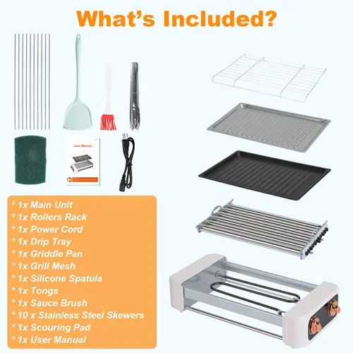 Enjoy effortless cooking with this 3-in-1 electric hot dog roller that combines an auto-rotating roller, BBQ grill and flat griddle in one compact unit. With 3 adjustable temperature levels (176–482°F), it heats up quickly and cooks evenly for perfect results every time. Designed for indoor and outdoor use, it holds up to 9 hot dogs, making it ideal for family meals, parties and game nights. The smokeless, non-stick surfaces and removable drip tray ensure easy cleanup, while built-in overheat protection and anti-slip feet provide safe, stable operation.