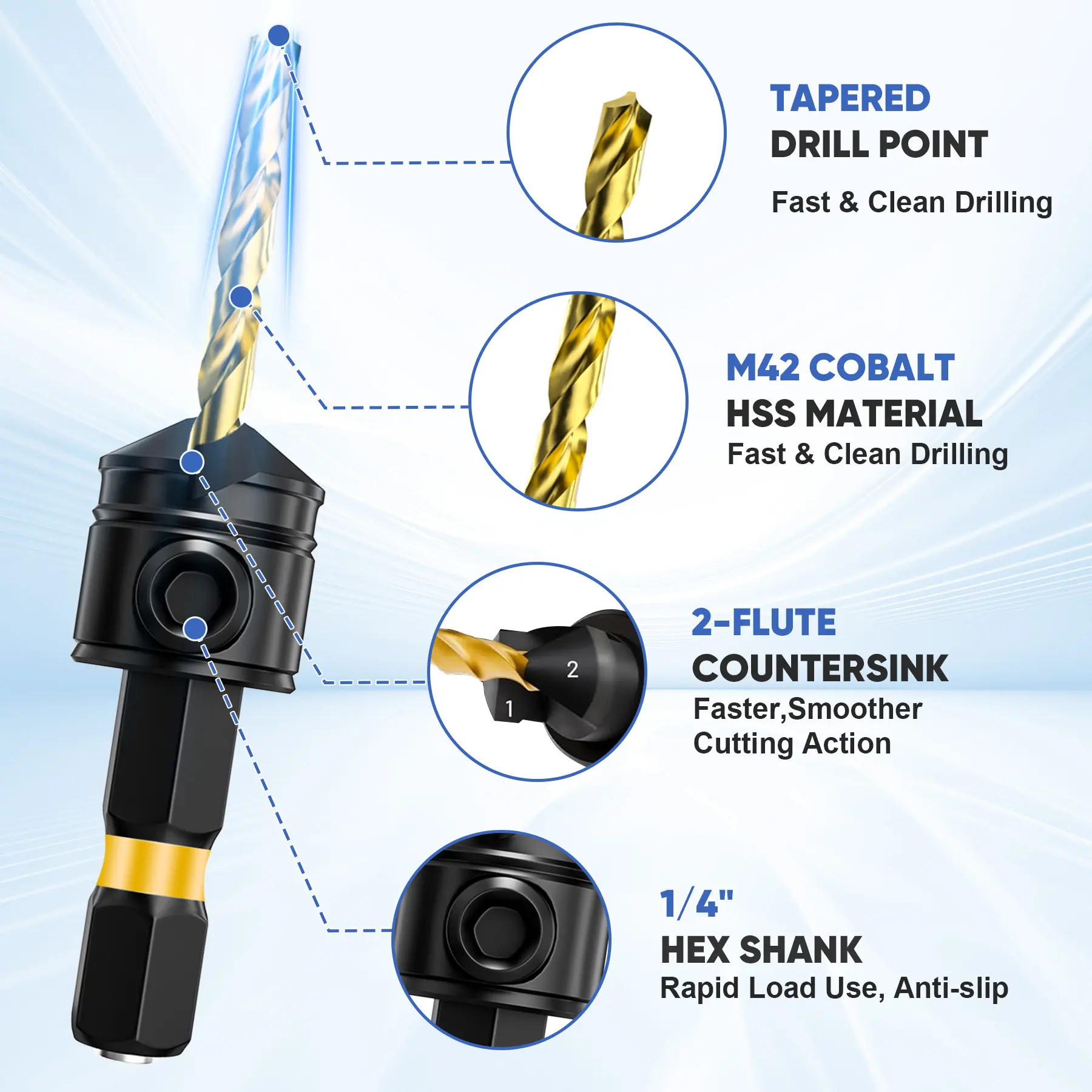 ·【M42 Cobalt High-Speed Steel】This countersink drill bit set for wood is made of high-quality M42 cobalt high-speed HSS, which has 20% higher wear resistance and toughness than standard high-speed steel. The wood countersink bit maintains cutting performance at high temperatures and its service life is twice that of ordinary drill bits.