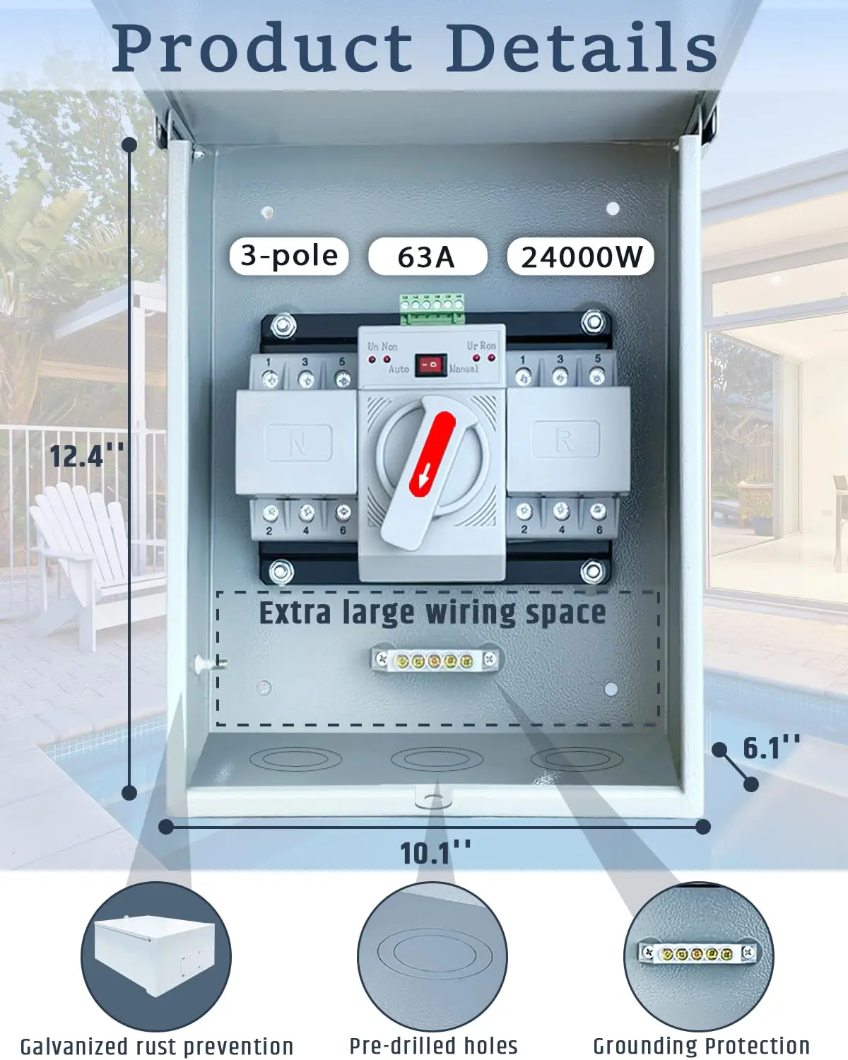 ·Sturdy and Durable: 63 amp generator transfer switch enclosure is made of galvanized steel that resists rust and corrosion. It meets NEMA 3R standards and can withstand harsh weather conditions, ensuring uninterrupted function even during rain, hail or strong winds