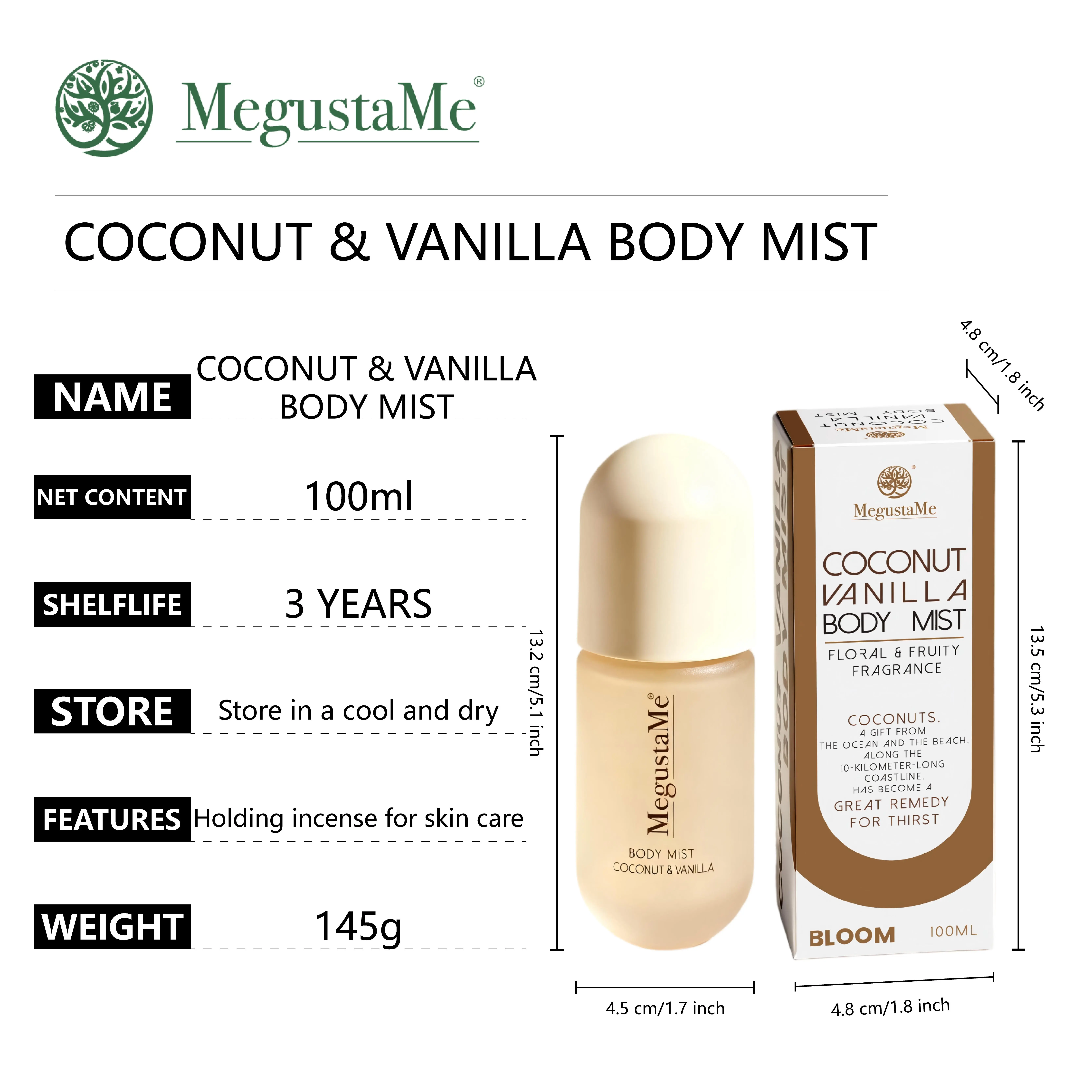·3. SIGNATURE SCENT: MegustaMe Coconut Vanilla Body Mist Delivers a luxurious floral and fruity fragrance that combines the fresh tropical essence of coconuts with the sweet warmth of vanilla for an irresistible aroma.