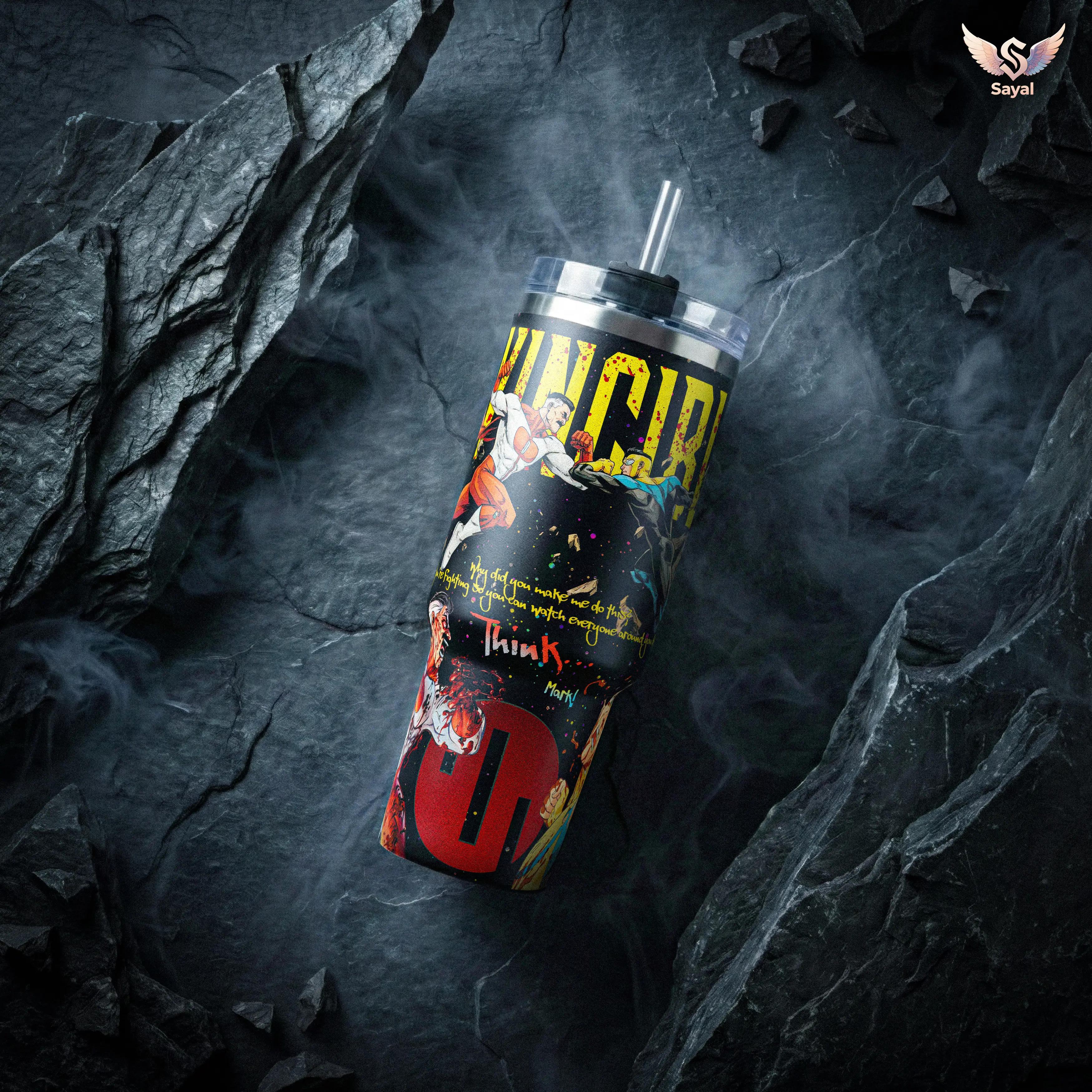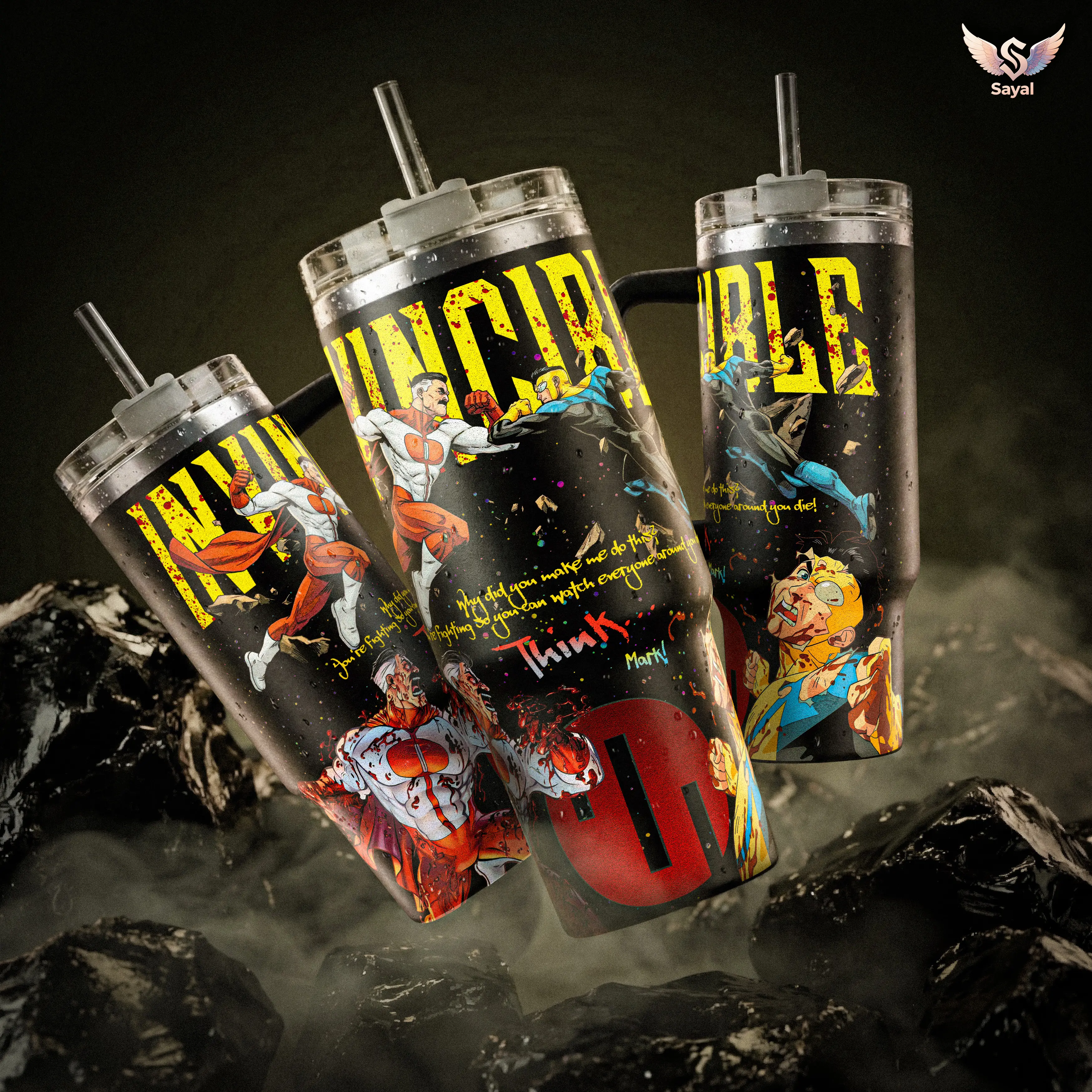 Omni-Man Vs Mark Grayson Invincible Think 40 oz Vacuum Insulated Tumbler with Handle Straw Fight Graphic, Keeps Drinks Hot/Cold 12H+ 18/8 Stainless Steel Travel Mug for Comic Fans Superhero Lovers Dark Aesthetic Merch Gift