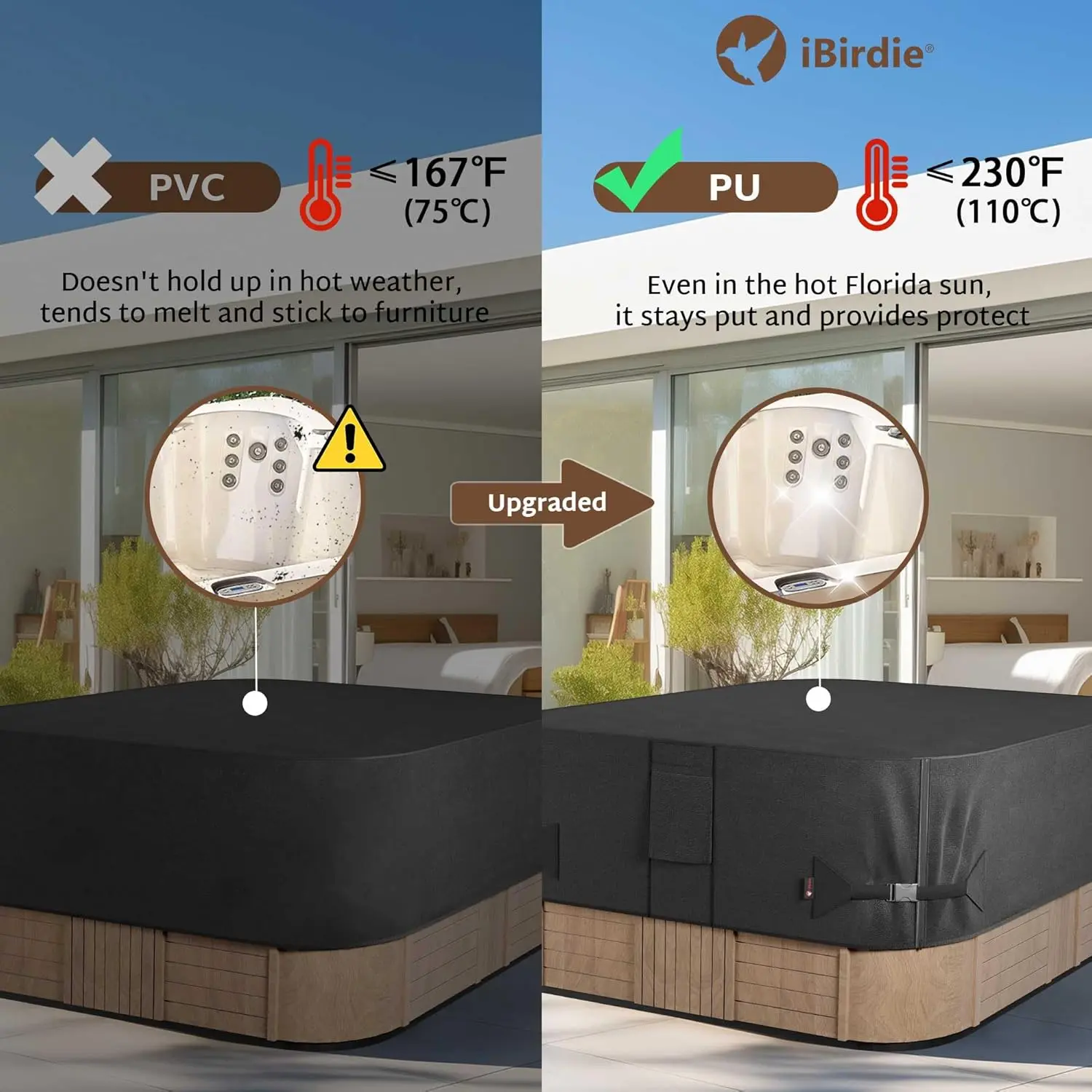 ·Well Made: iBirdie Hot Tub cover is made of heavy-duty fabric with a waterproof coating; All seams are double-stitched for strength and have a sealant attached to the seams to prevent tears, leaks, etc