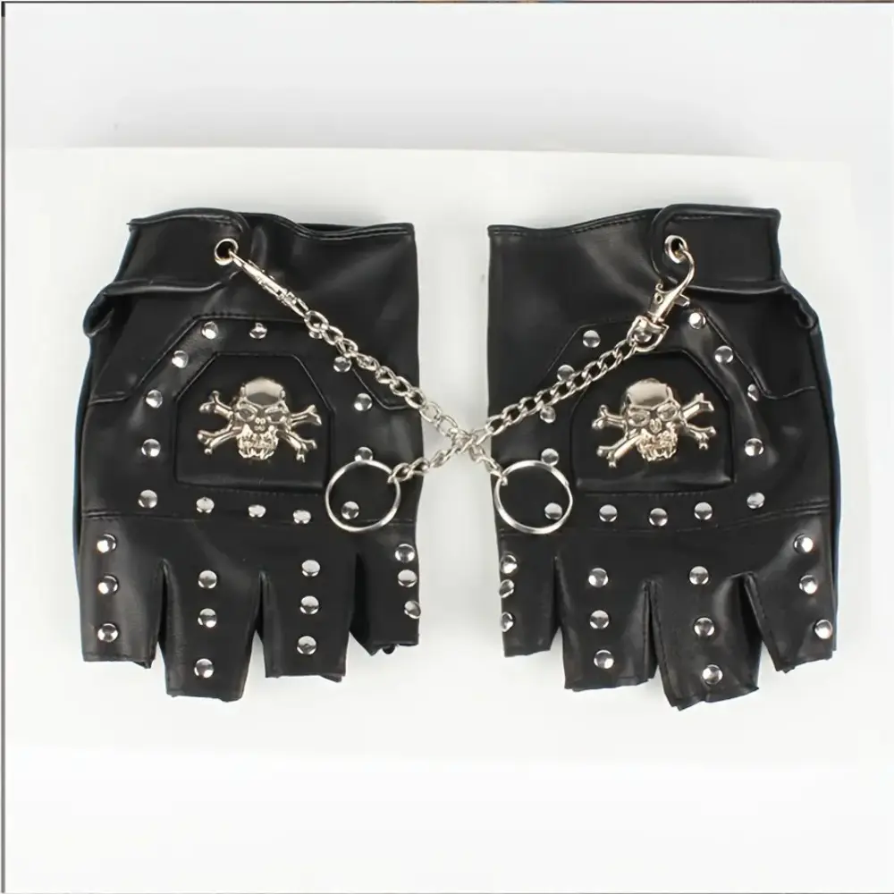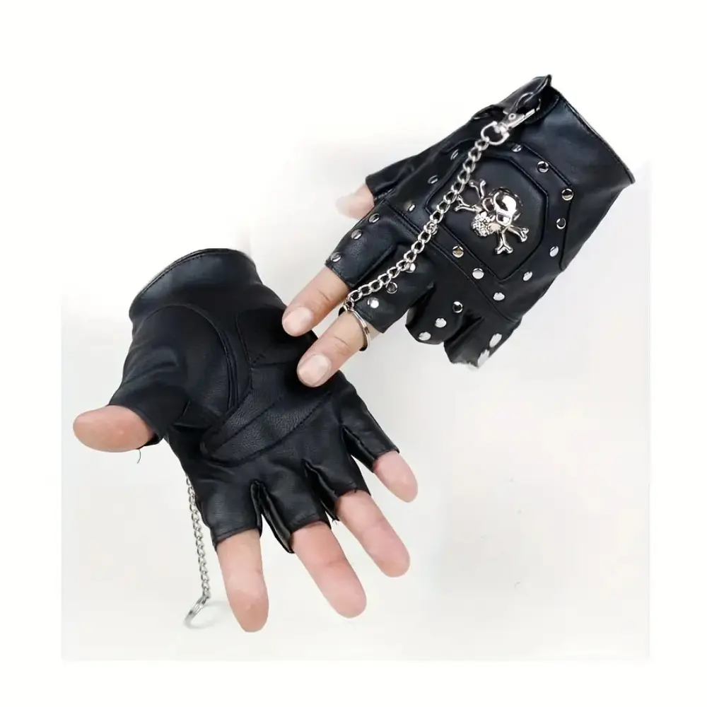 Skull Half Finger Leather Gloves Design & Style: These men's leather gloves feature a skull design with chain and rivet details. Perfect for a punk or pirate look. Functionality: Ideal for outdoor sports, these gloves offer anti-slip properties. They are suitable for motorcycle riding and performance riding. ️ Versatility: These novelty gloves are versatile, suitable for various activities. They add a unique touch to your outfit. Material: Made of leather, these gloves provide a durable and stylish option. They are perfect for those who love a bold and edgy look. Usage: These gloves are great for motorcycle riding, outdoor sports, and performance riding. They offer both style and functionality.