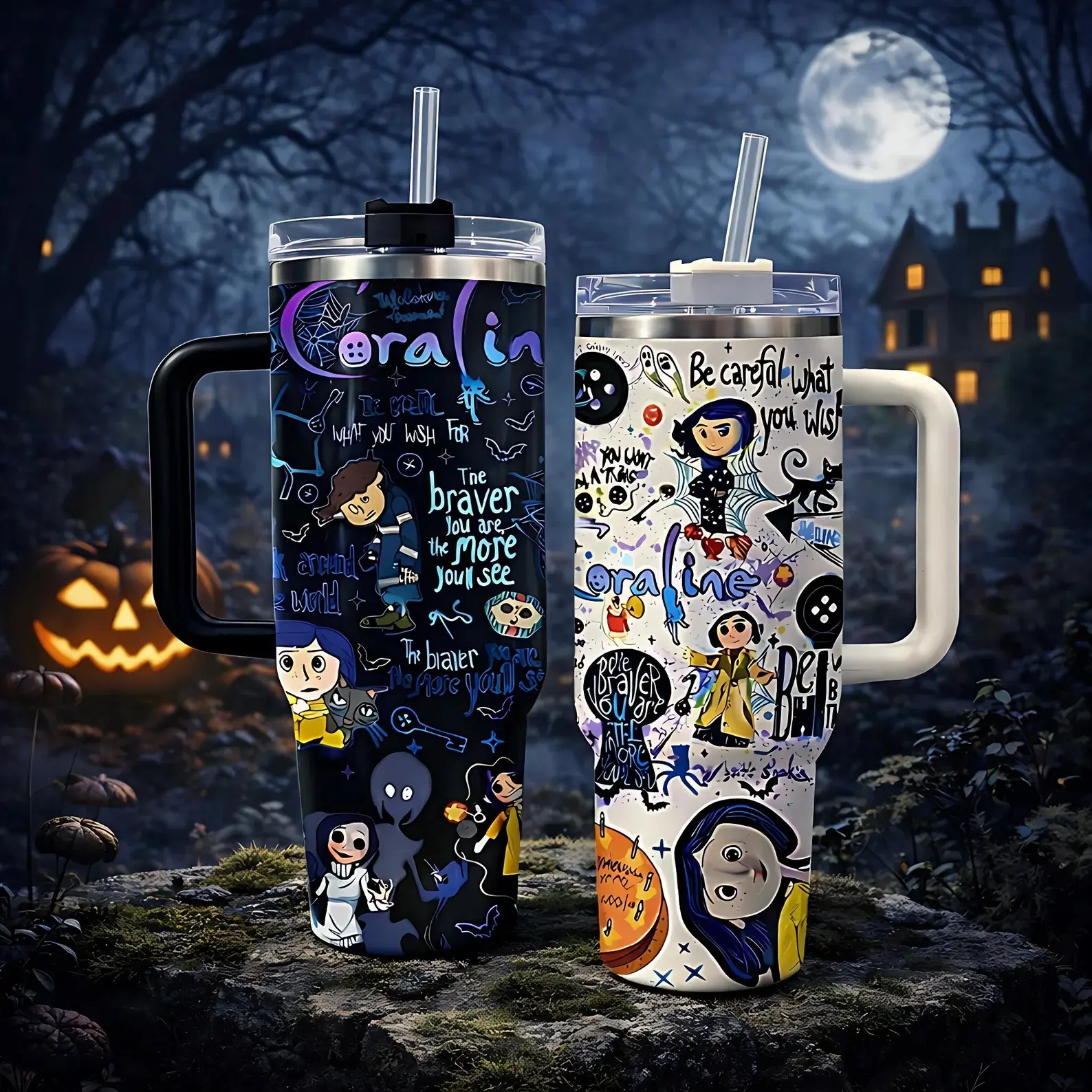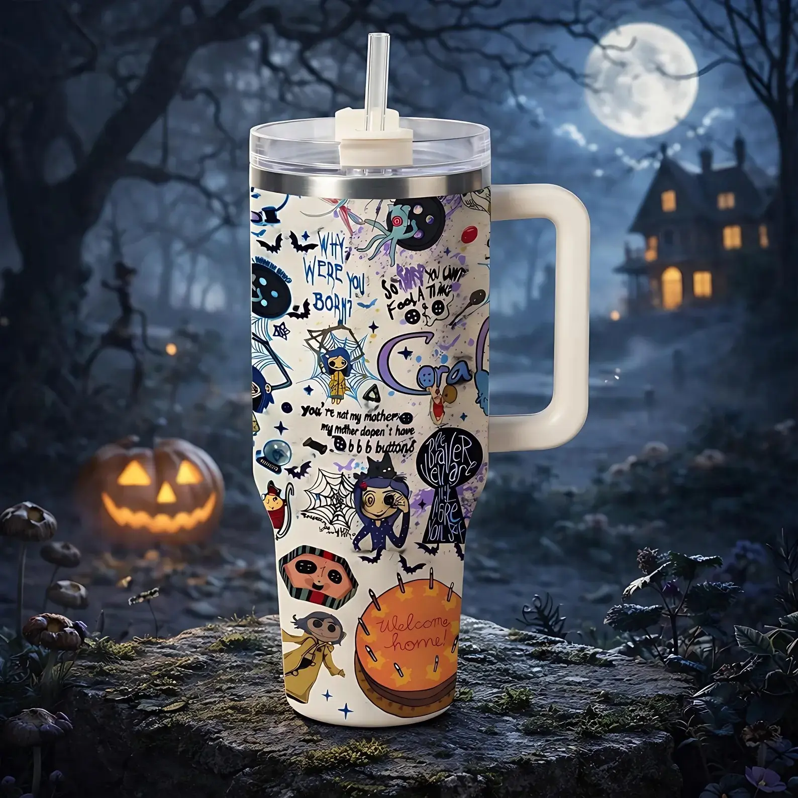 Coralin Durable Insulated Tumbler 40oz with Handle and Lid, Spooky Cat Pattern Stainless Steel Mug, Large Capacity Coffee Water Bottle