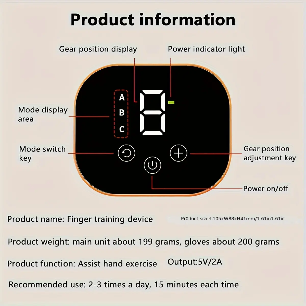 Please note: This device cannot be charged! It requires a 5V/2A power source to function properly! Important notice! Important notice! Important notice! Power supply: This device must be connected to a 5V/2A power source via a USB cable to operate properly! Do not charge! It is recommended to use a 5V/2A power source. Size selection: Before choosing, please measure the length and width of your hand. If your fingers are wide, it is recommended to increase the actual size by one centimeter. Usage guide: If you feel stiffness in your hands, it is recommended to perform a 5-minute massage and stretching before doing any strength training. Recommended training frequency: It is recommended to exercise 2-3 times a day, for a duration of 15 to 30 minutes each time