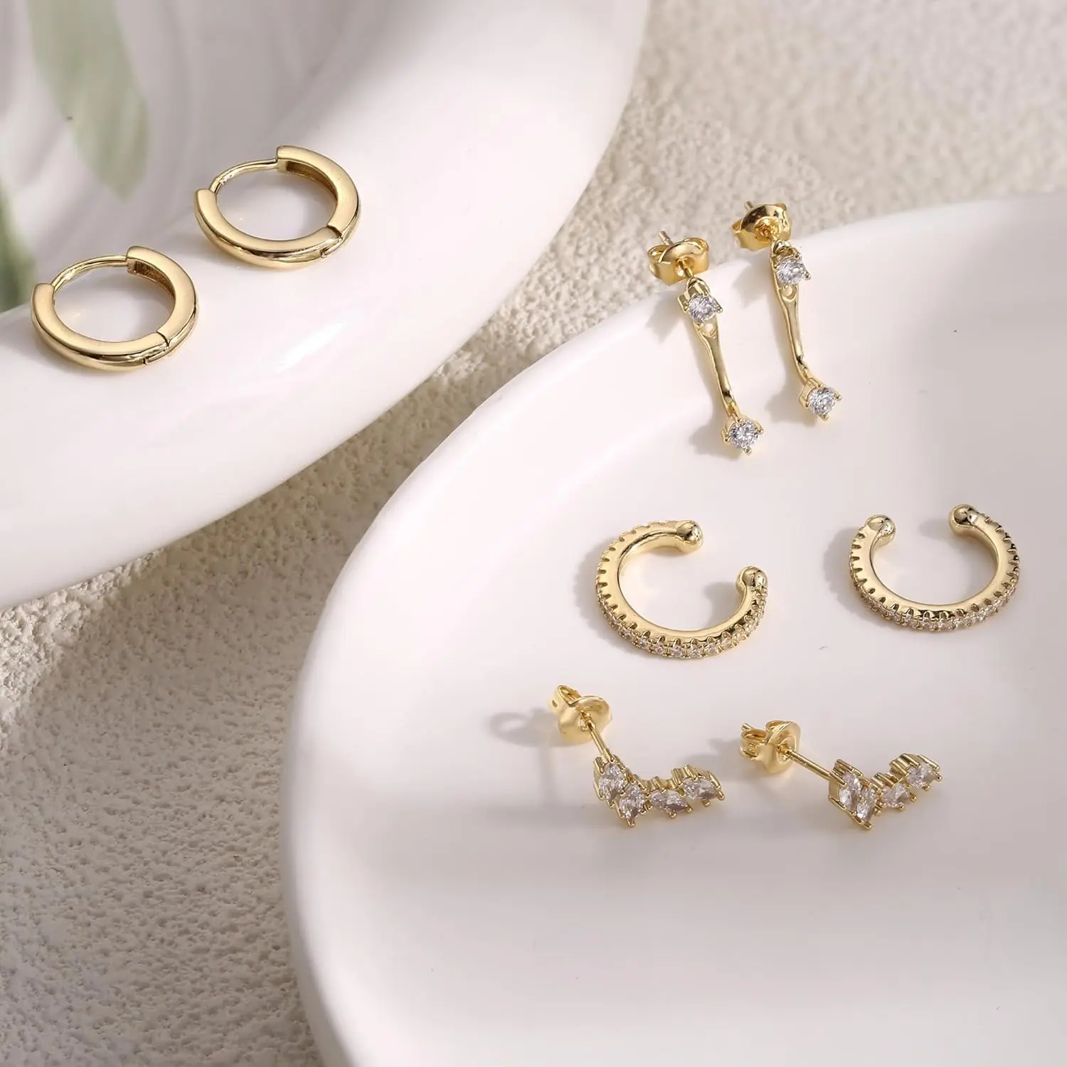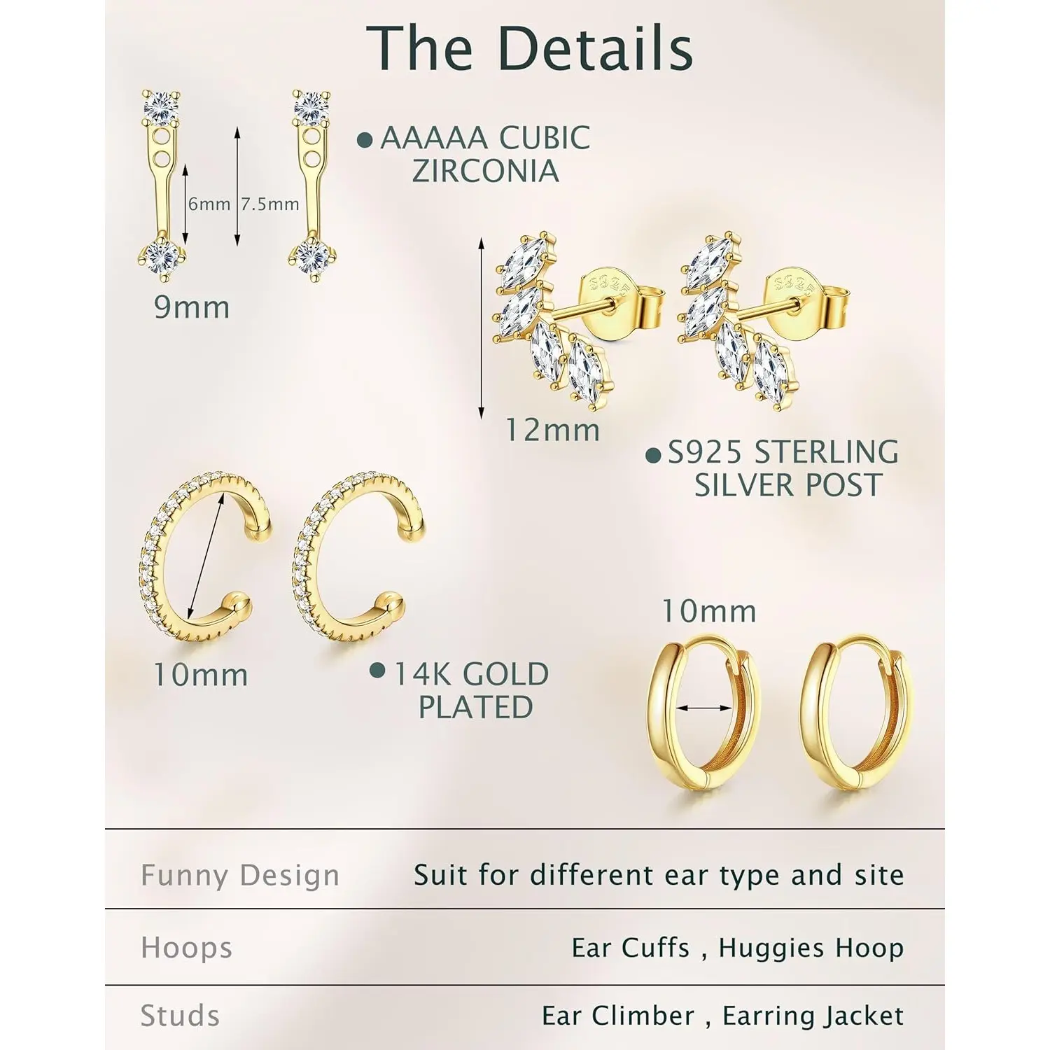 ·Dainty Stud Hoop Earring Pack:This set includes 4 pairs of earrings - 1 pair of cz ear cuffs with a 10mm inner diameter, 1 pair of ear jackets with a 15mm height, 1 pair of leaf studs with a 12mm height, and 1 pair of classic hoop earrings with a 10mm inner diameter. The perfect size for daily wear, these earrings offer versatile styling options for various occasions.