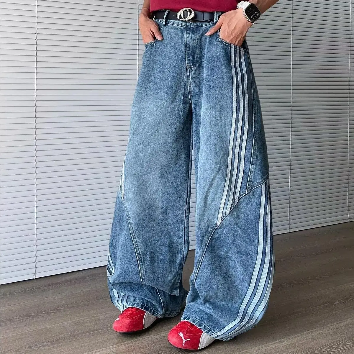 Men'S Side Stripe Curved Scimitar Jeans, Summer American Retro Loose Casual Washed Deconstructed Distressed Wide Leg Pants