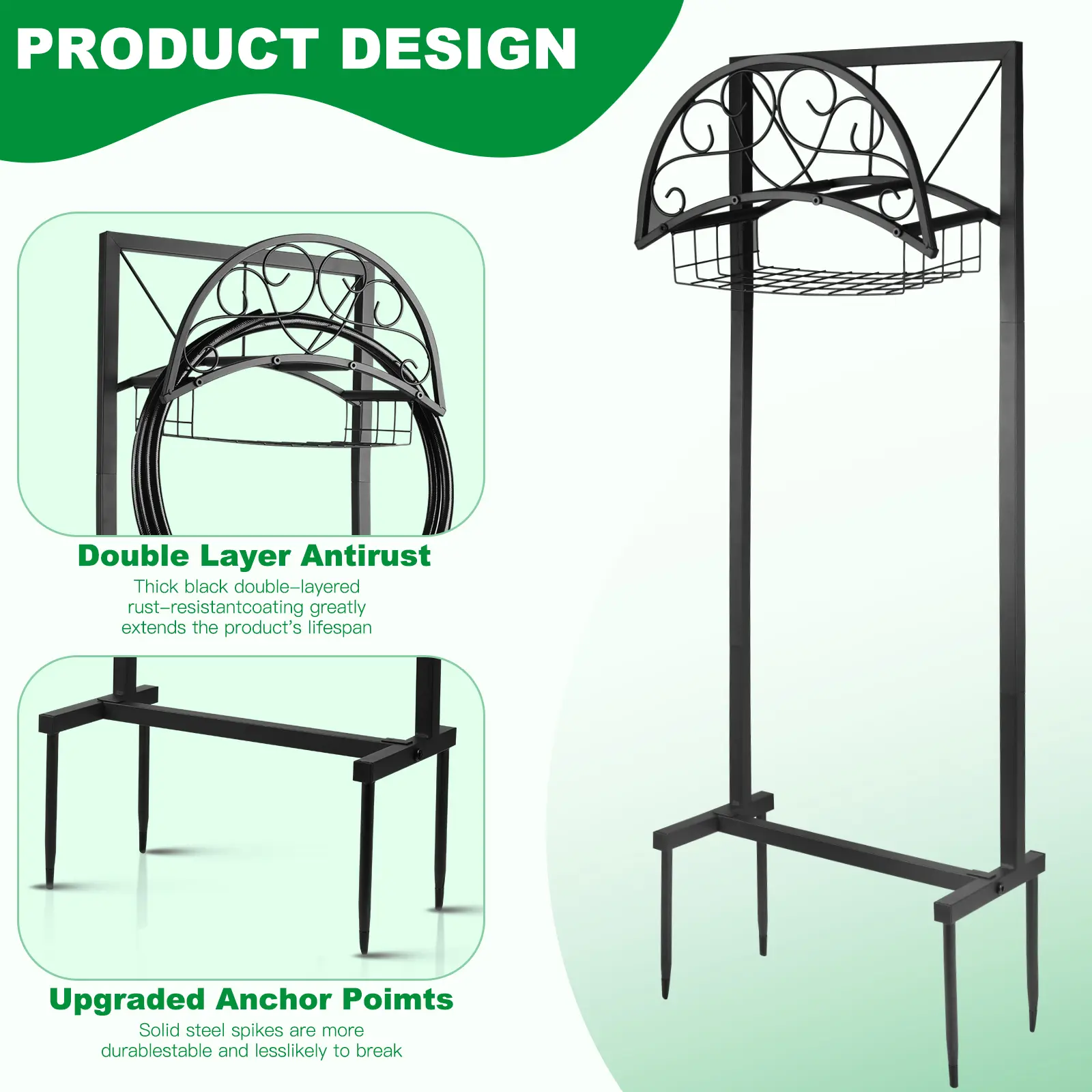 The newly designed hose holder features four reinforced anchor points, providing exceptional stability and support. It can securely hold a 151ft garden hose without tipping over. The 4-anchor structure resists bending or breaking, even on uneven ground.