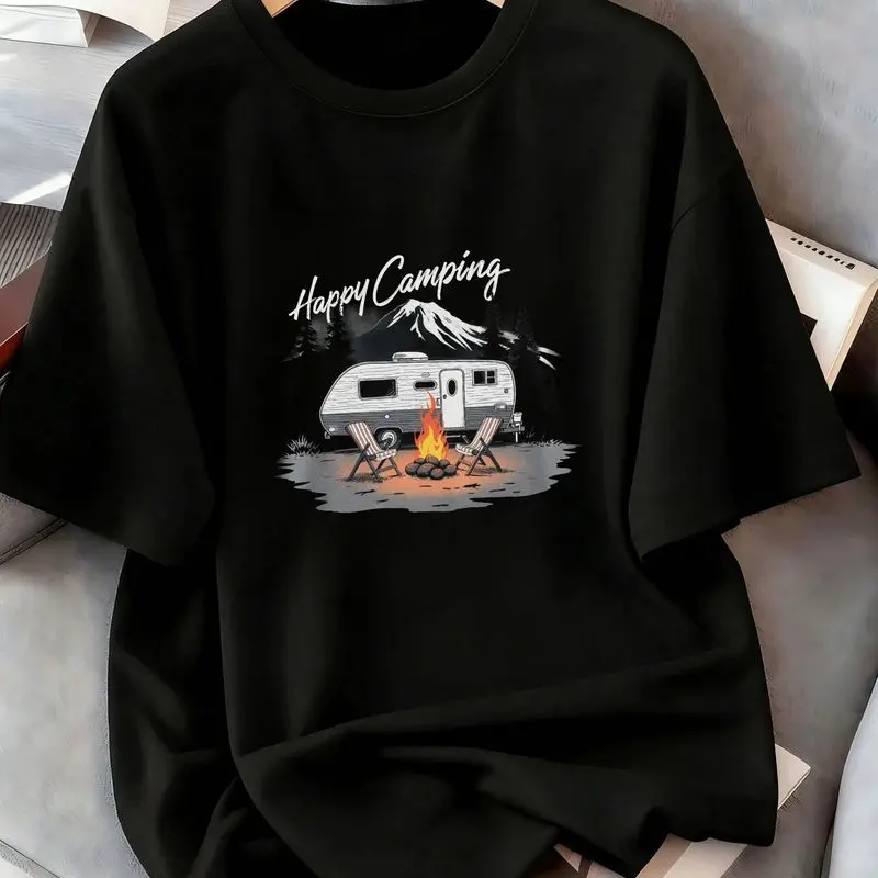 Happy Camping Vintage Camper Mountain Tee - 100% Cotton Short Sleeve T-Shirt, Super Soft Breathable Crew Neck Graphic Top for Outdoor Adventure, Summer Travel, Skateboard Style Casual Wear