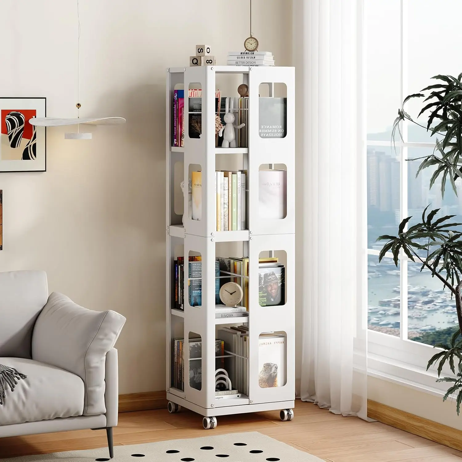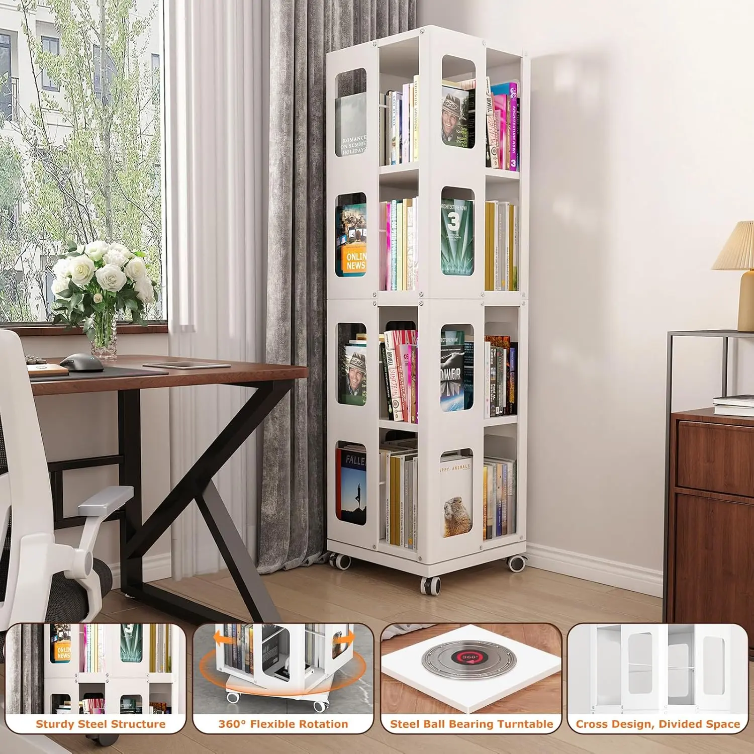 ·【Perfect for All Ages】Our steel rotating bookshelf seamlessly adapts to any room in your home. Whether you’re an adult seeking an elegant bookshelf or a parent looking for a children’s book storage solution, this compact, 4-tier bookshelf is perfect for displaying and organizing a wide range of items. Its space-saving design makes it a versatile addition to any living room, bedroom, hallway, kid’s room, or balcony.