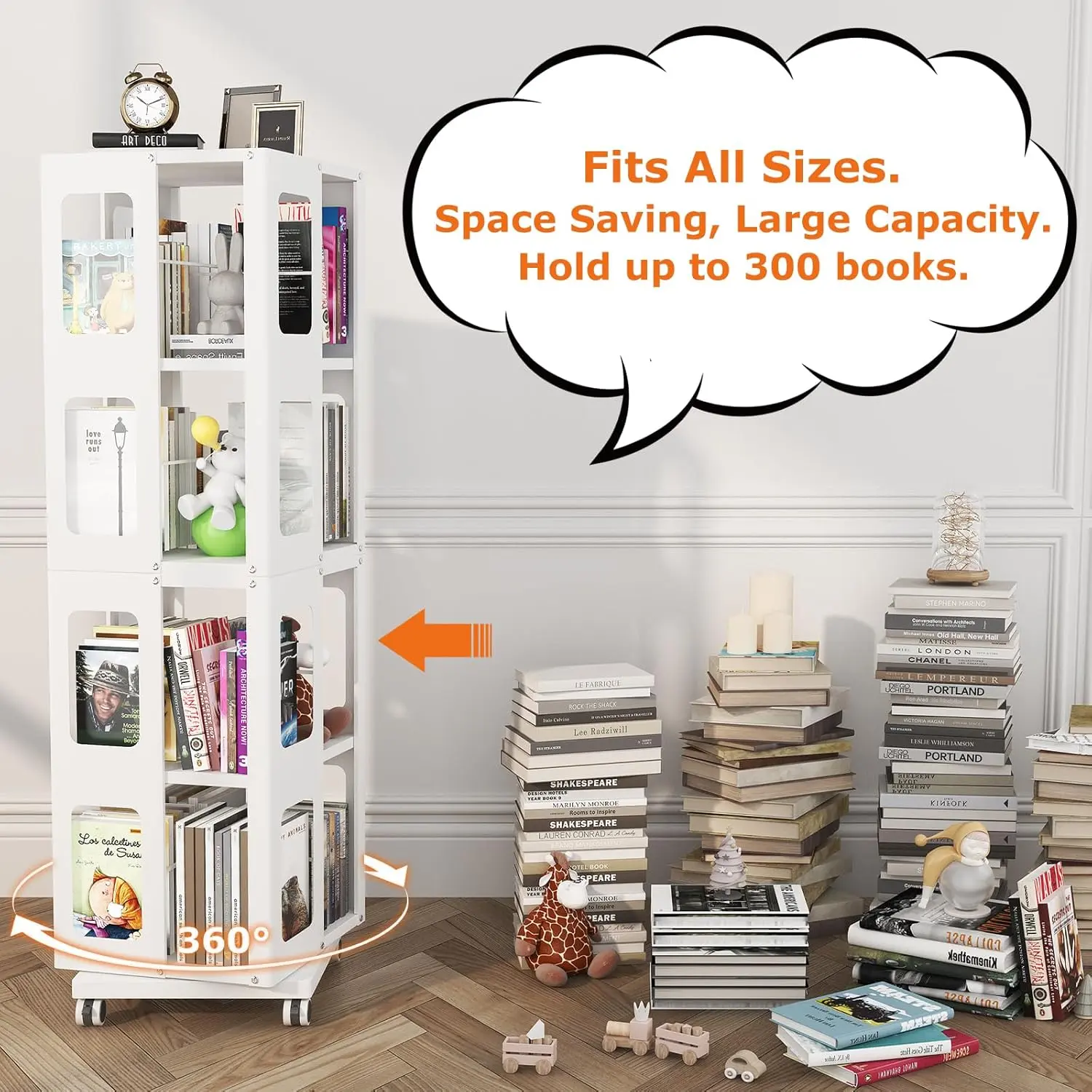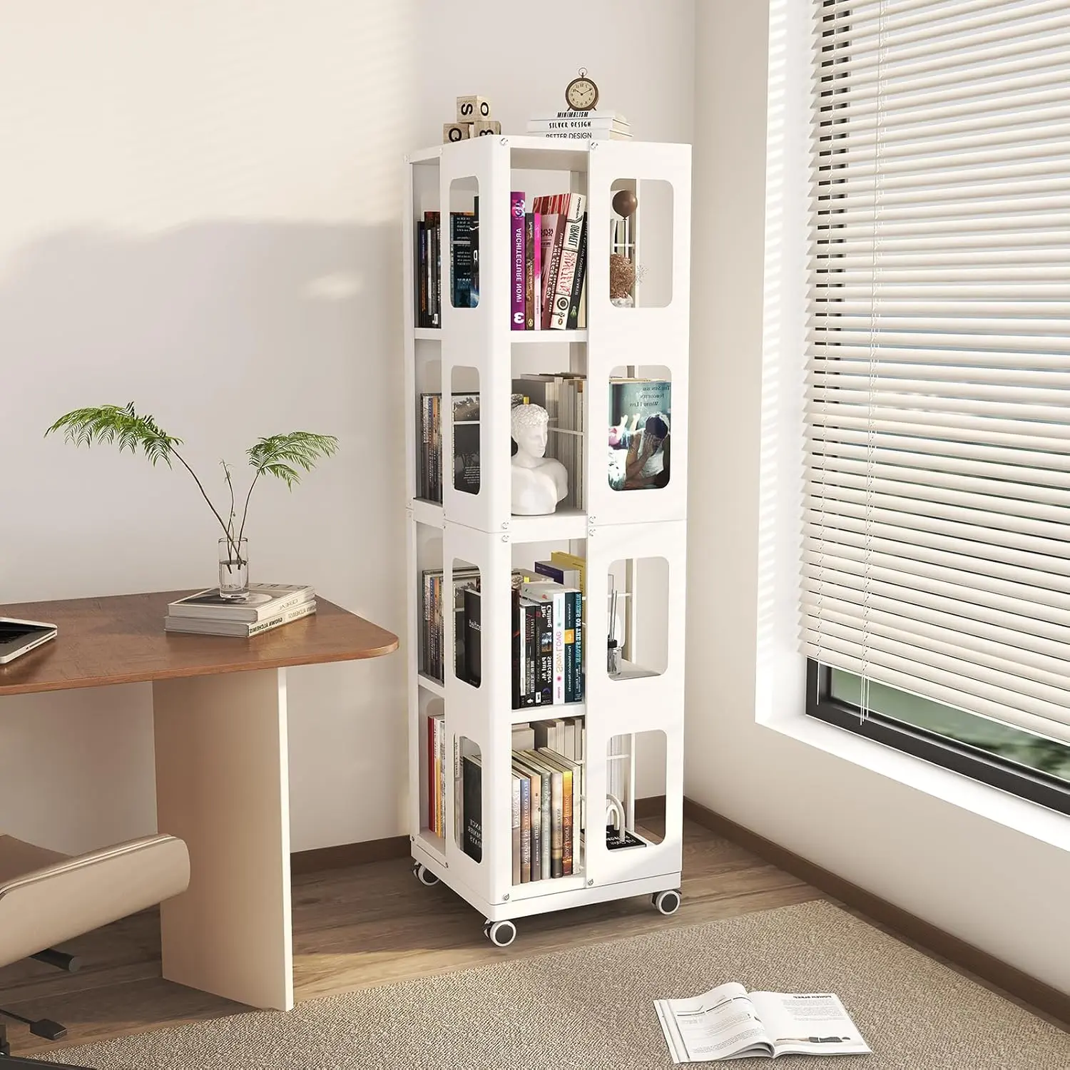 ·【Sturdy 360° Spinning Bookcase with Locking Wheels】This versatile rotating bookshelf tower provides seamless 360° rotation for effortless organization. The lockable swivel wheels ensure both mobility and stability, while a wheel-less option allows for a steady, flush-to-ground stance.