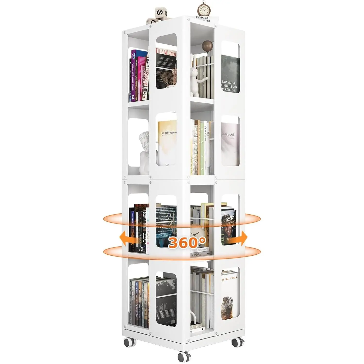 ·【Large Storage Capacity】This steel rotating bookshelf offers a generous capacity, measuring 54.72" x 16.54" x 16.54" (139cm x 42cm x 42cm), with 4 tiers perfect for storing a wide range of items, from pantry staples to books, toys, and artwork. Maximize your living space and organize flexibly with this spacious solution.