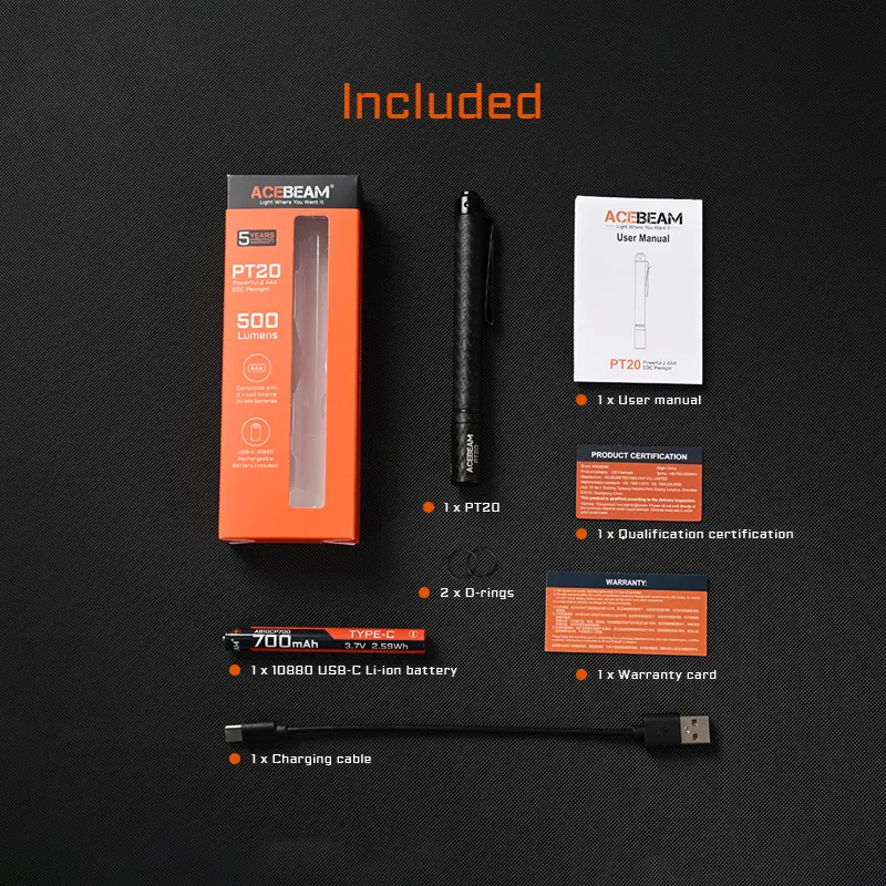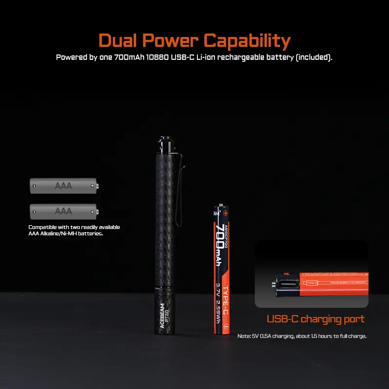 • One 10880 USB-C Li-ion battery (included), compatible with two AAA Alkaline/Ni-MH batteries
