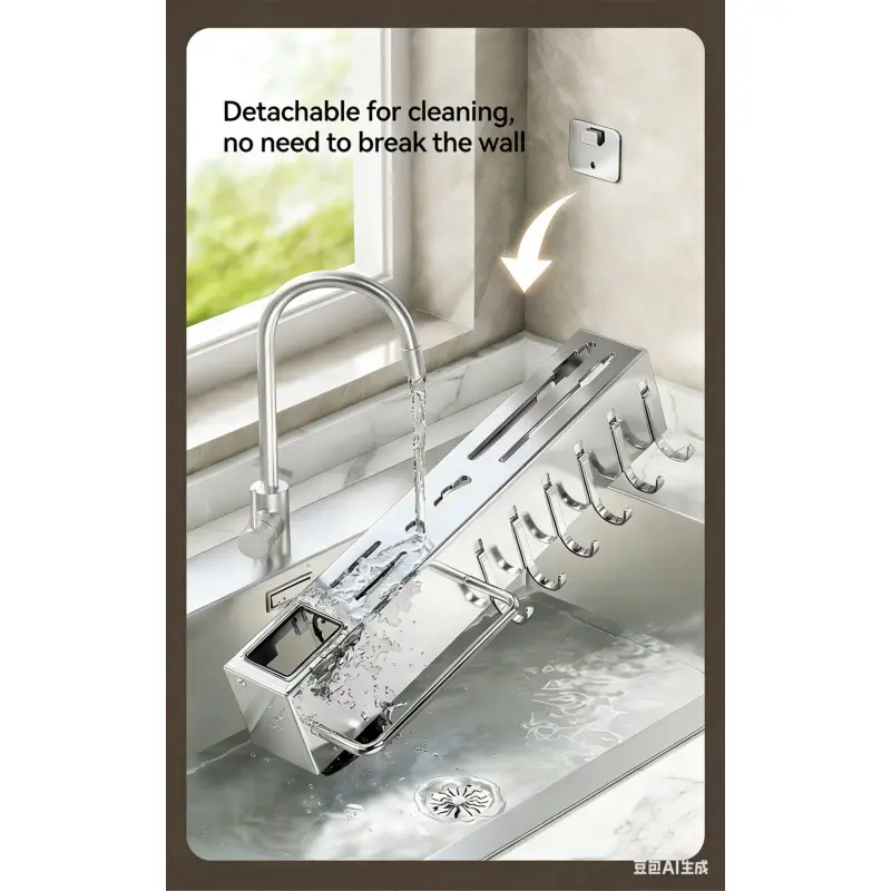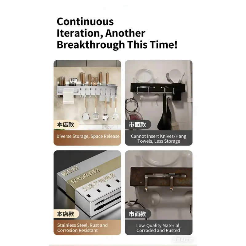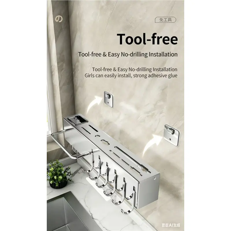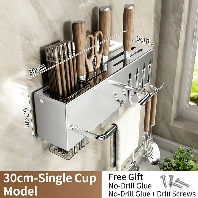 The reasonable partition layout design features dedicated slots for safely storing various kitchen knives, fruit knives, and scissors.The independent chopstick holder allows for the organized placement of chopsticks, spoons, and forks.Paired with movable hooks, it can hang various kitchen utensils such as spatulas, ladles, and egg beaters.The side towel bar can hold cleaning cloths and hand towels.This one rack handles the storage of all small kitchen items, completely freeing up countertop space and instantly making the kitchen neat and organized