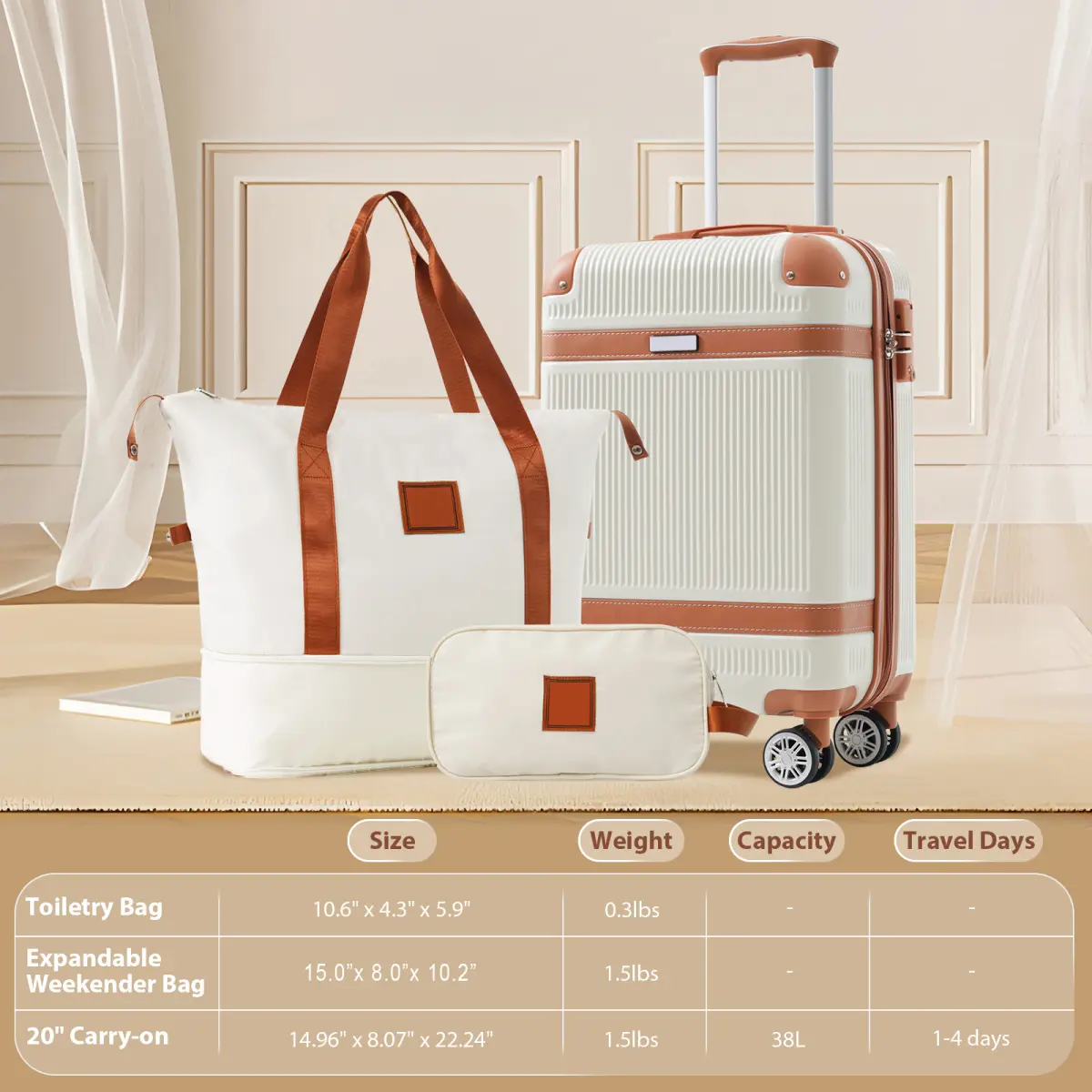 ·Complete Luggage Set: This suitcase set includes a 20-inch suitcase, expandable duffel bag, and toiletry bag, perfect for short trips, weekend getaways, or business travel.