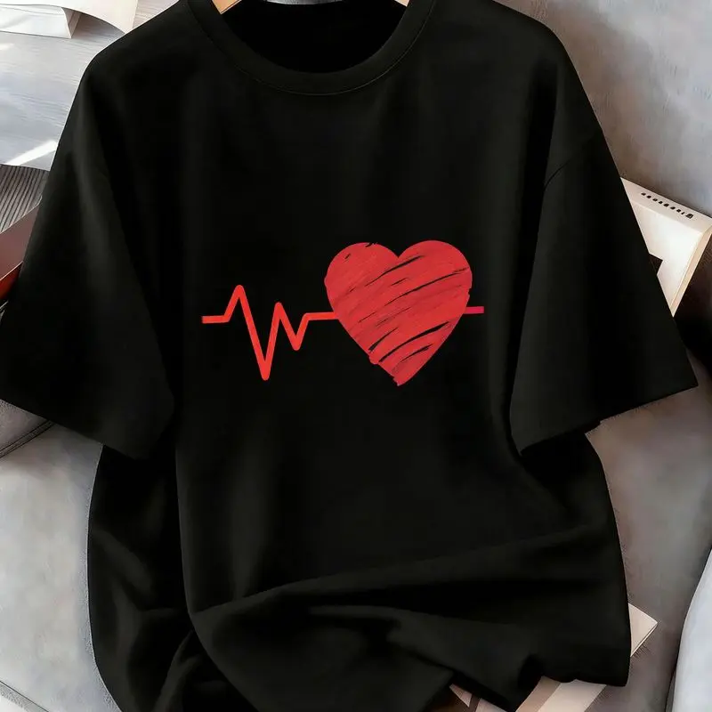 Heartbeat ECG Graphic Tee - 100% Cotton Short Sleeve T-Shirt with Bold Red Heart Design, Super Soft Breathable Urban Streetwear for Skate Lovers, Perfect Casual Gift for Valentine's Day or Everyday Style